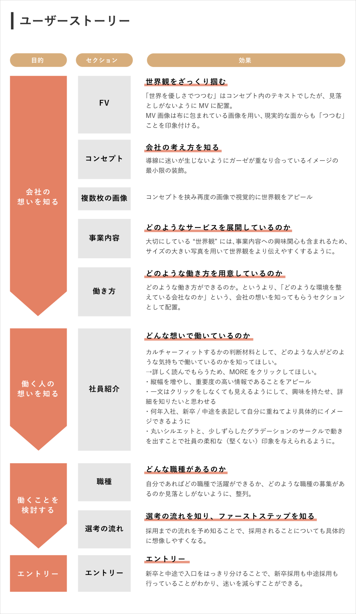 カルチャーフィットしたユーザーにエントリーしてもらうことがこのLPのゴールであるため、そのための情報設計を以下のように考えました。