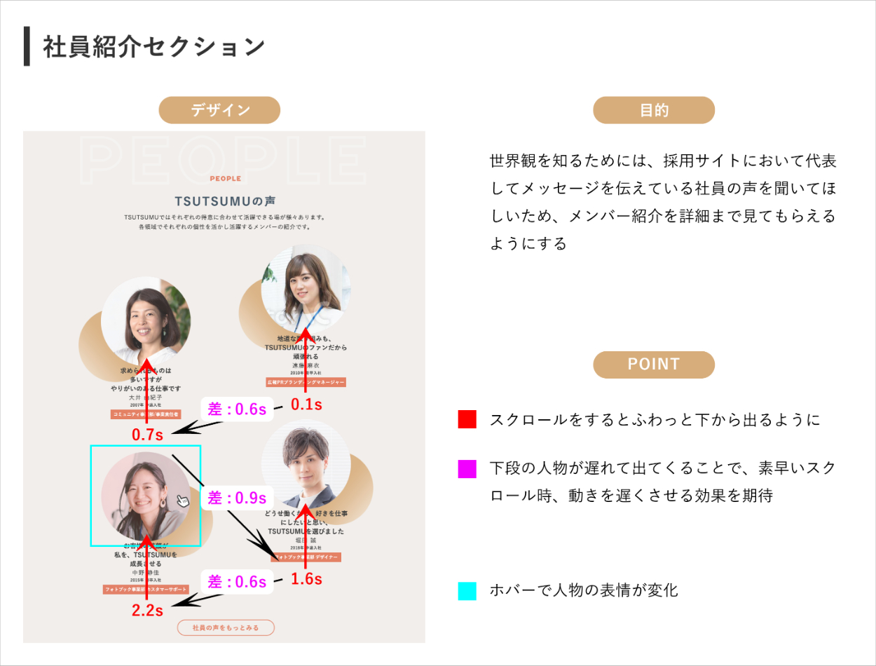 しかし、あくまでも採用サイトなので、特に後半のセクションでは重要度が上がっている各セクションの見出しにネイビー(#485968)を使用し、柔和な印象の中にも締まった印象も与えられるように配色しました。