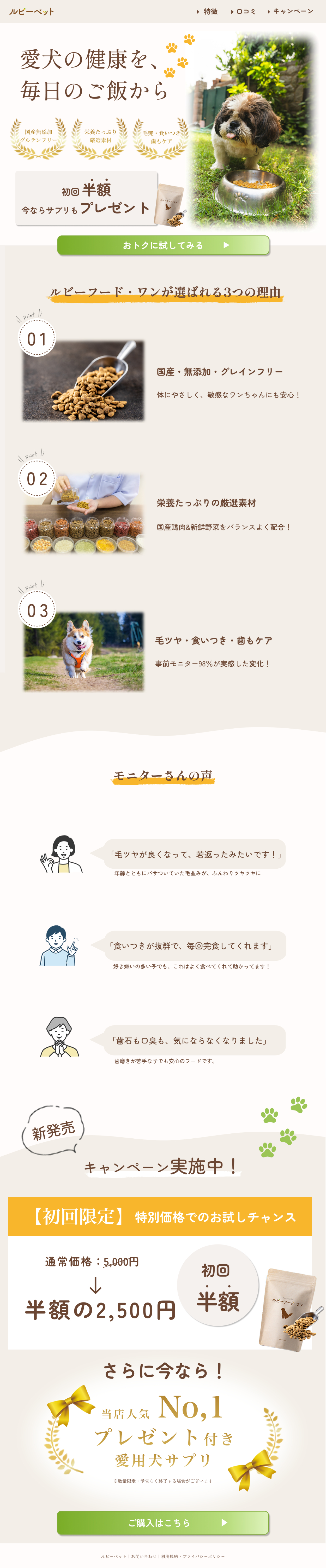 ワンちゃんの健康管理フード「ルビーフード・ワン」を販売開始することになりました。 GDNバナー広告、リスティング広告、弊社公式HP内バナーからLPへ誘導し、購入していただく流れになります。 新発売キャンペーンとして初回のみ半額2,500円で販売、サンプルとして当店で人気のワンちゃん用サプリも1つプレゼントします。
