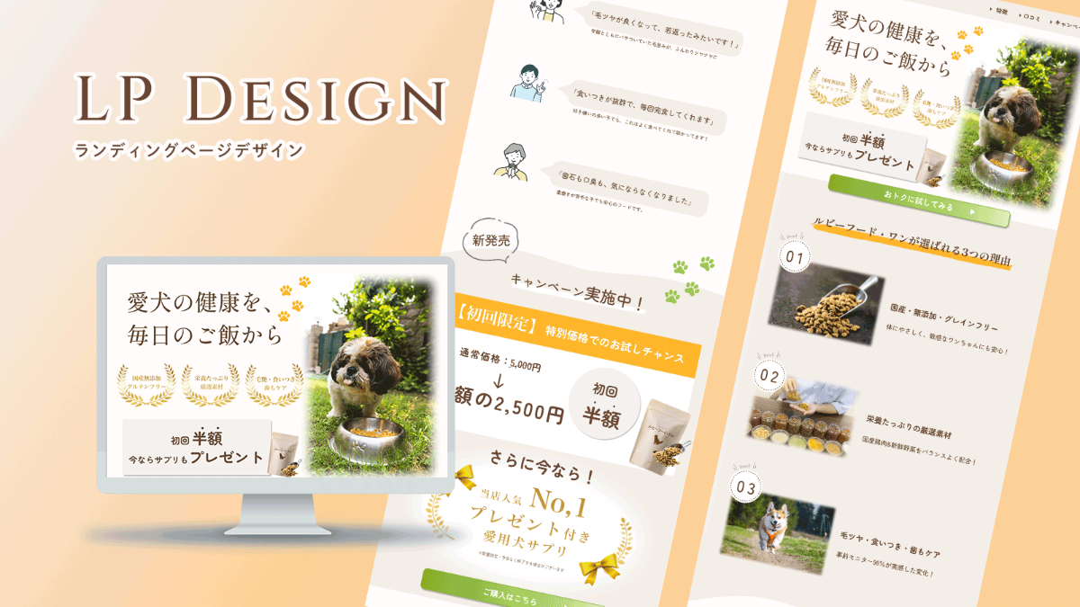 - 愛犬の健康管理フードになるので、かわいい元気な印象のあるLPをお願いいたします。