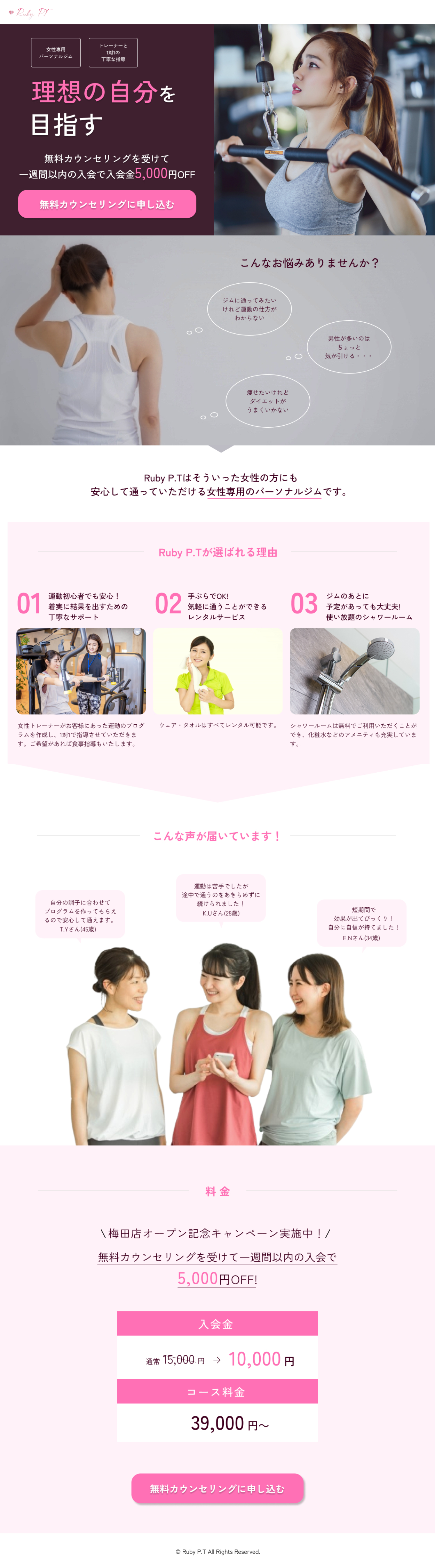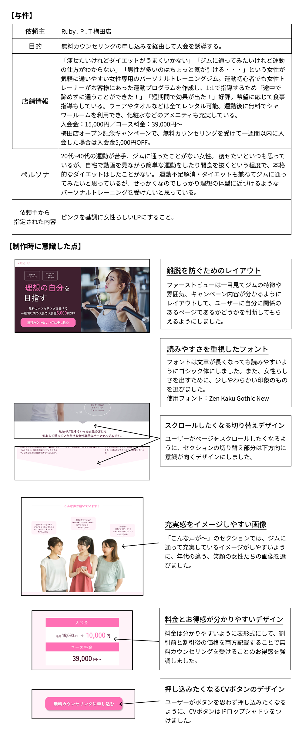 【課題】女性専用パーソナルジムLPデザインカンプ Onishi|おおにし Webデザイナー OVERVIEW WebデザインスクールHerTechの課題として、女性専用パーソナルジムのLPをFigmaで制作しました。 YEAR 2025