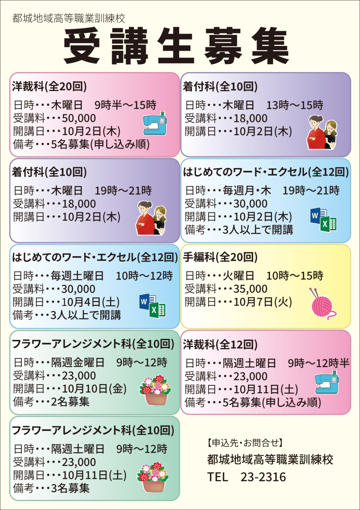 チラシ|受講生募集チラシ Midori Fukushima スタートラインに立ちたいWebデザイナー(仮) OVERVIEW Webデザイン科の課題により、受講生募集チラシを制作しました。 全体的に淡い色を使い文字を見やすく、それぞれ関連する画像を配置してどんな科目か分かりやすくしました。
