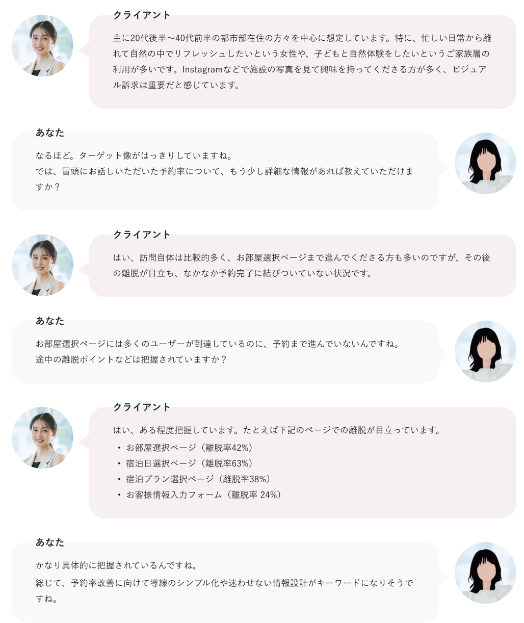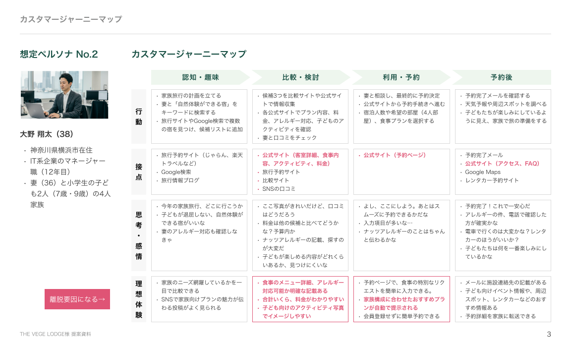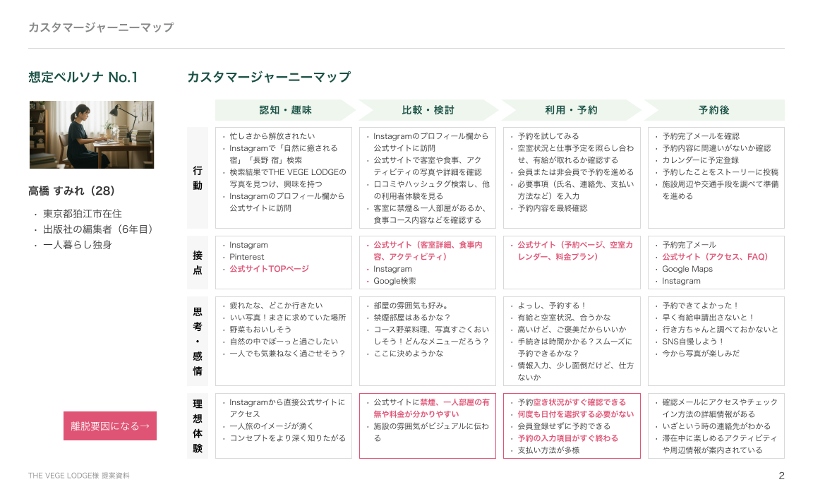 まず、カスタマージャーニーマップを作成し、ペルソナがWebサイトにアクセスしてからの感情と行動を詳細に分析しました。これにより、クライアントの課題認識(各ページのUI改善)とは異なる、真の課題(潜在的な離脱要因)を複数洗い出しました。