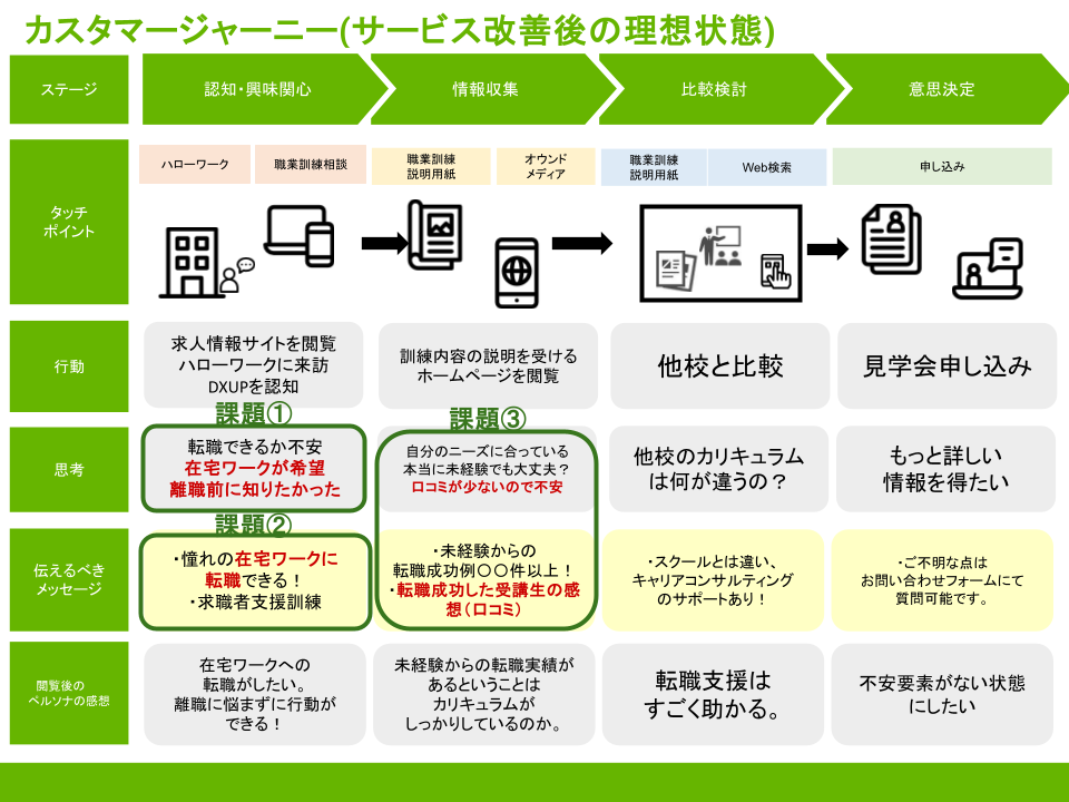 ③サービス改善後の理想状態のカスタマージャーニーを作成