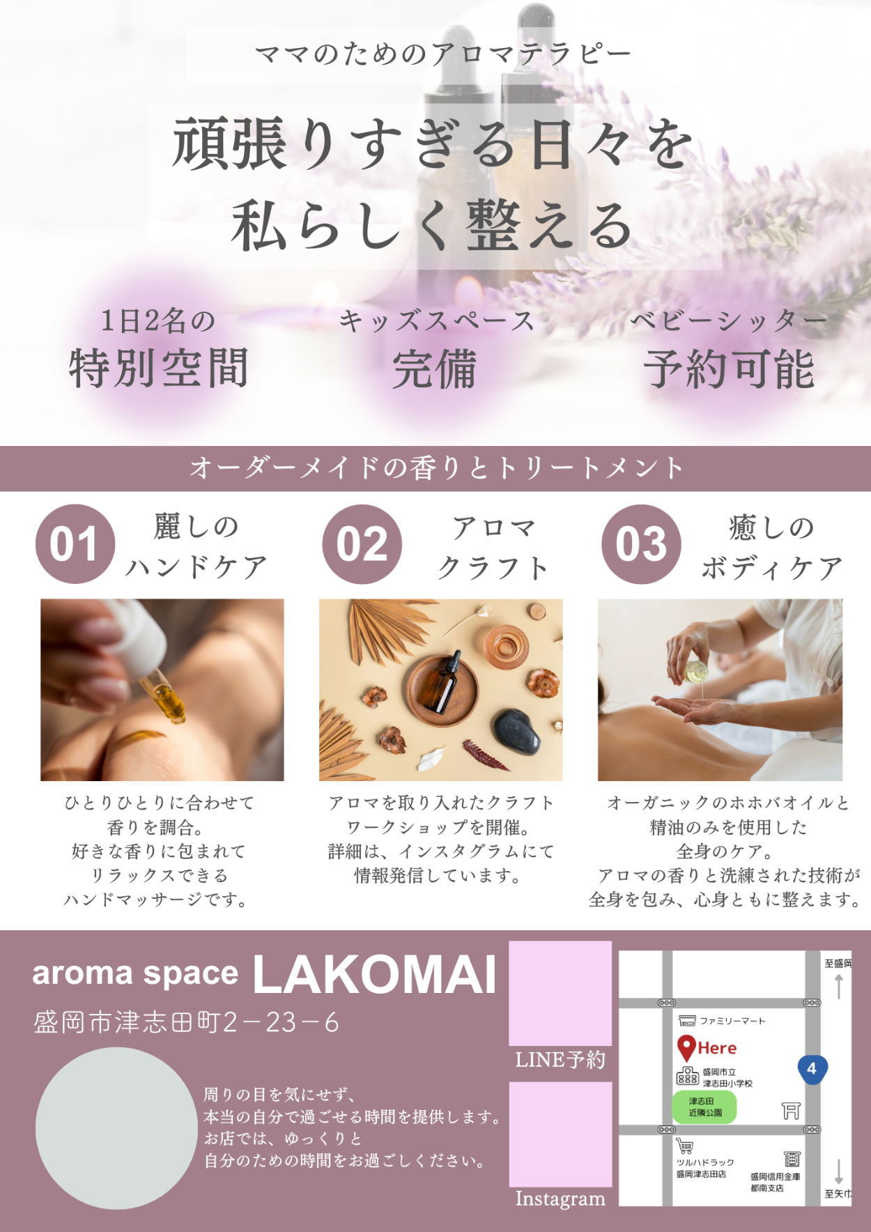 ・コンセプトからお店の方が考えた「頑張りすぎる日々を私らしく整えるアロマテラピー」というフレーズを大きくして、子育てで疲れている30代ママたちに寄り添ってくれるお店であることを表現しました。