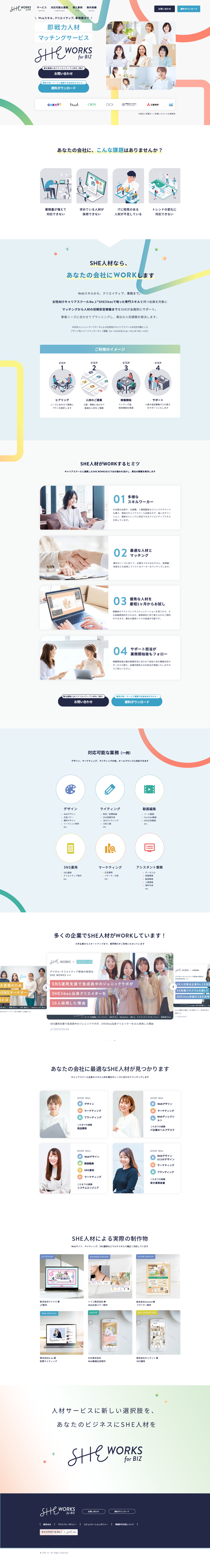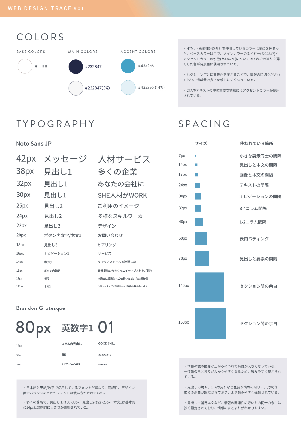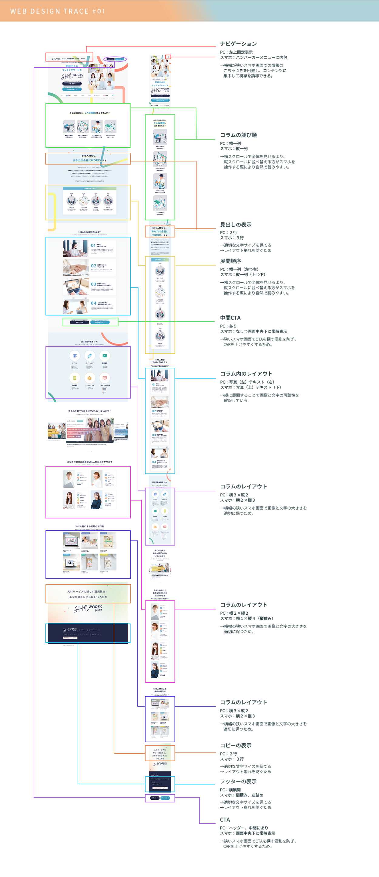 【WEBサイト】SHE Works様 Minami’s Portfolio クリエイター OVERVIEW WEBサイトデザインのトレースと分析をしました。 サイトPC vs スマホ レスポンシブスタイルガイド
