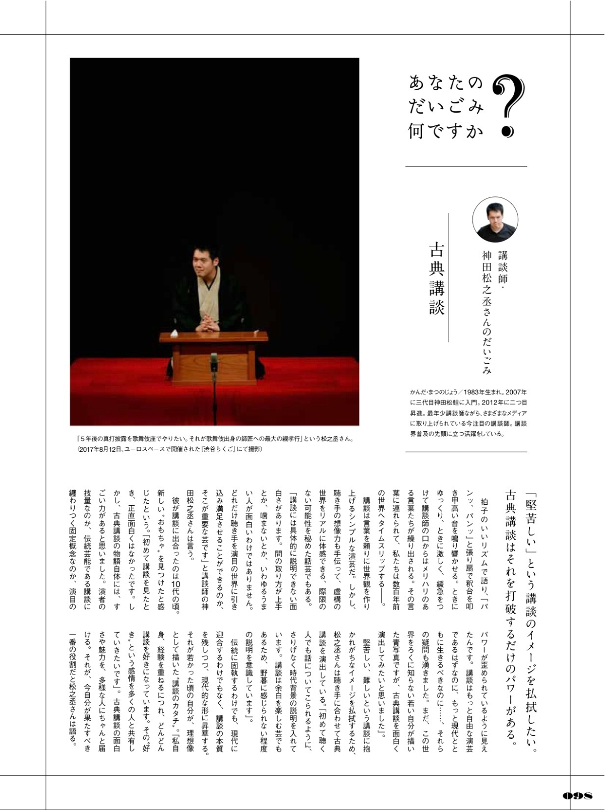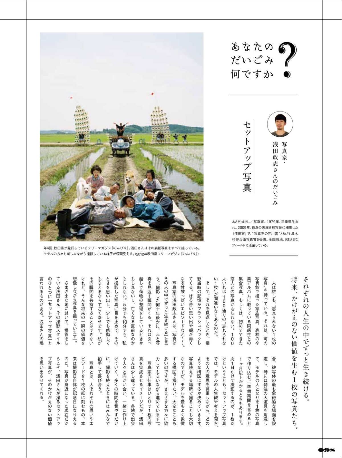 WRITING:インタビュー記事/あなたのだいごみ何ですか? 吉田健二 ディレクター・エディター・ライター OVERVIEW 食雑誌「だいごみ」のインタビュー企画 YEAR 2017 - 2018 WRITING THEME仕事のだいごみを伝える。CASE1: 浅田政志さん(写真家)CASE2: 神田松之丞さん(講談師)CASE3: 大西順子さん(ジャズ・ピアニスト)【担当業務】・取材・原稿作成