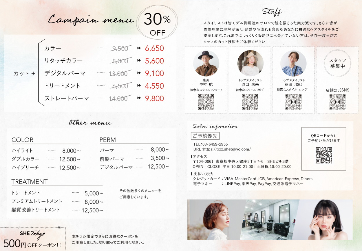 SHElikes MULTI CREATOR PROJECTの制作課題で、美容室のオープニングキャンペーンのフライヤー制作に取組みました。(制作期間:1週間)