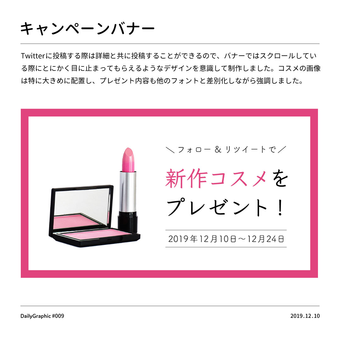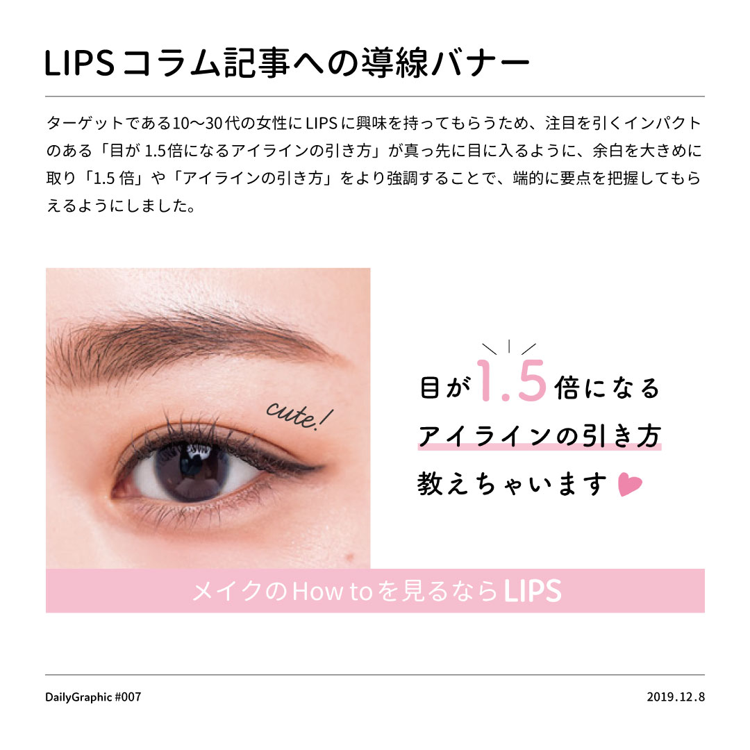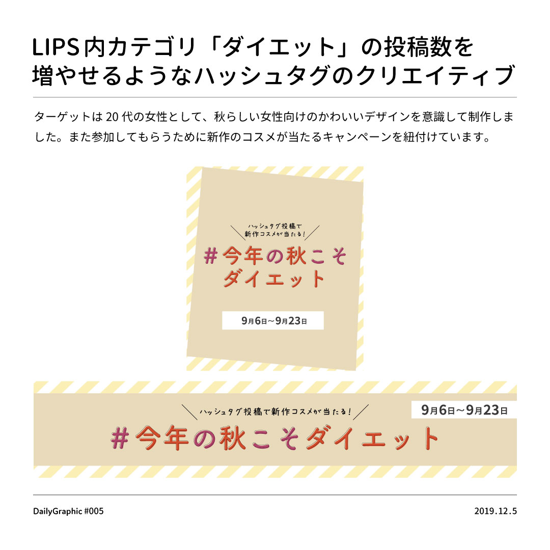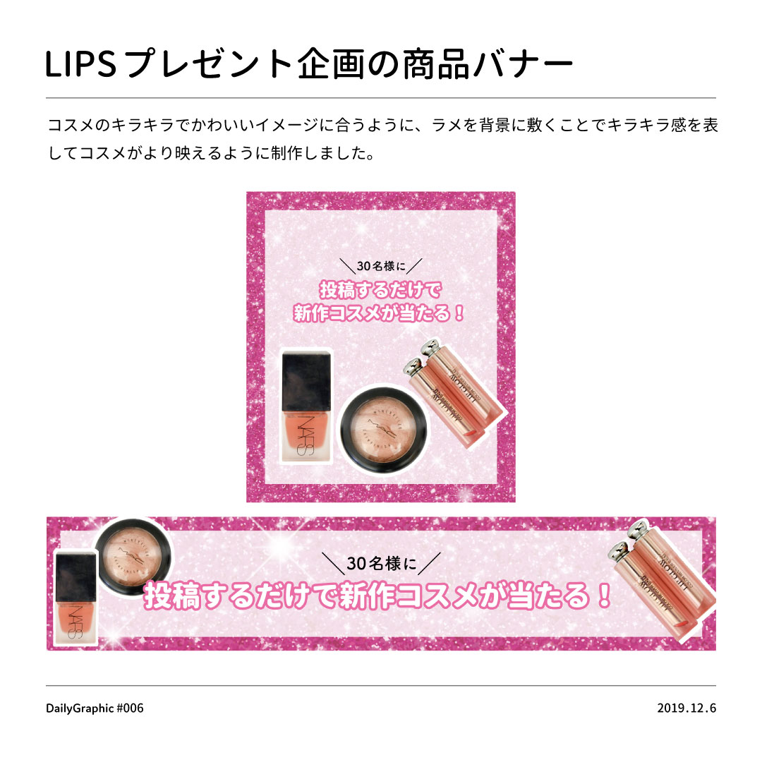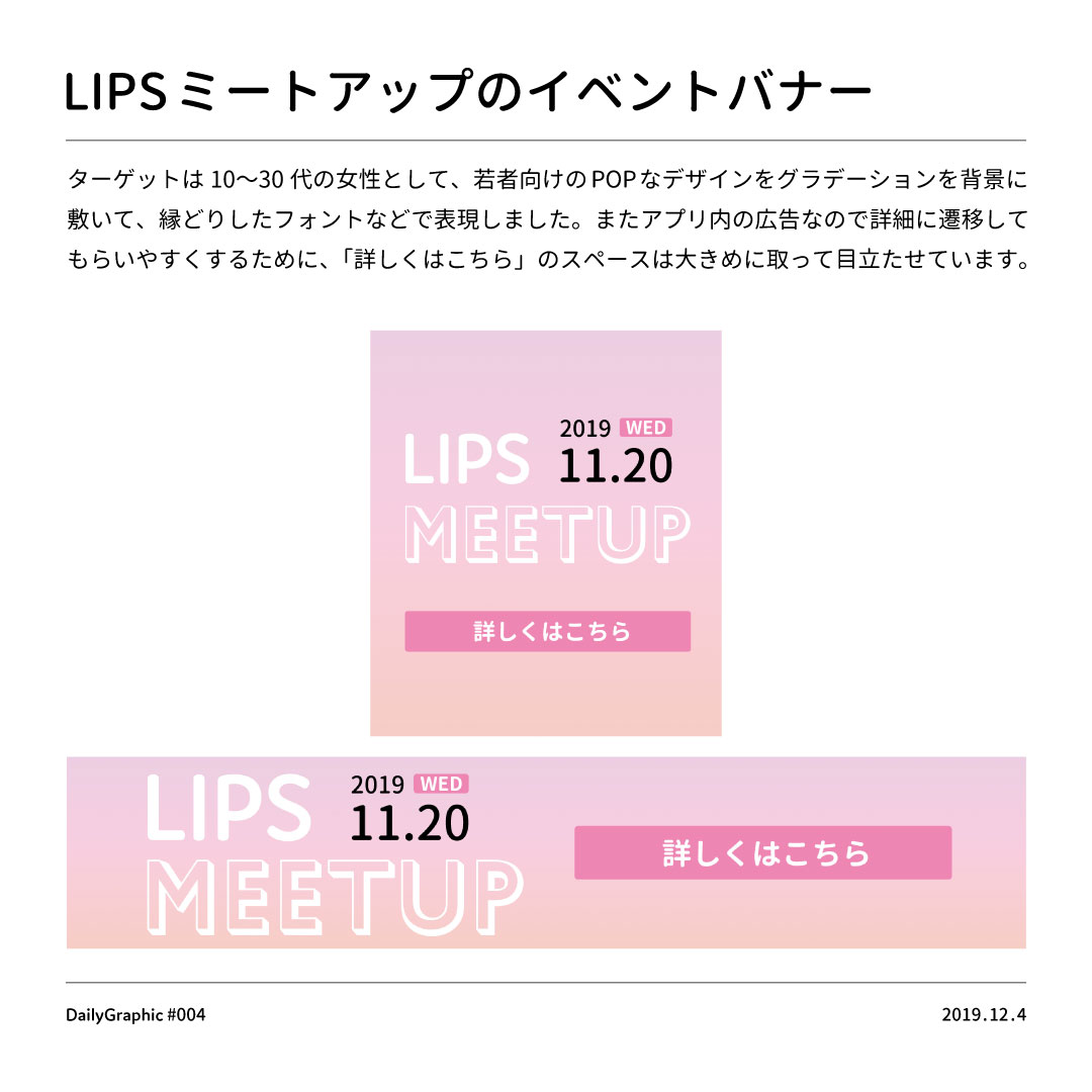 DailyGraphic Cocoda!×LIPS ずっきー きっかけデザイナー OVERVIEW 10日間グラフィックデザインのお題に沿って制作し、工夫点などをまとめました。 YEAR 2019 Cocoda!が今後提供予定のDailyGraphicのテストユーザーとして、LIPSとコラボしたグラフィックデザインのお題に沿って10日間制作し、工夫点などをまとめました。