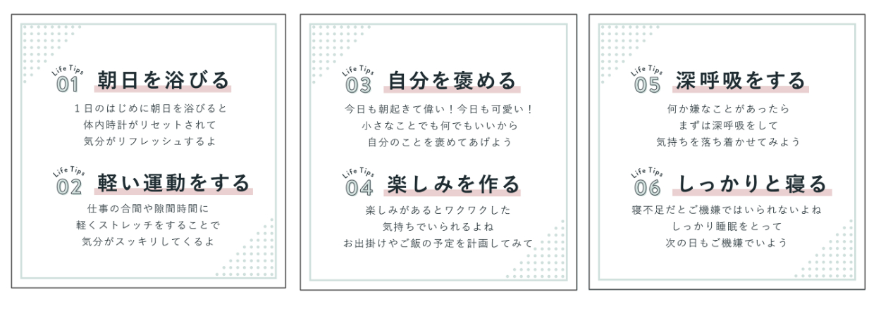 デザインの4原則(近接・整列・強弱・反復)を意識して制作しました。また、テーマが「1日をご機嫌に生きるための朝やることリスト」なのでワクワクするようにあしらいにドットを使用したり「LifeTips」の文字を半円に沿って可愛らしいデザインにしました。