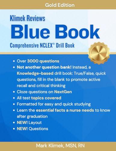 Comprehensive Review Drill BookThe Blue Book: Gold Edition is the result of over three decades of development, stemming from the extensive resources Mark Klimek created for his Klimek Review course. While he continues to offer these courses in both online and in-person formats, he's now making this valuable resource accessible to everyone.In this latest version, the Blue Book: Gold Edition has received a comprehensive update, including over 1000 additional questions. Encompassing all the vital topics covered in the exam, this guide goes beyond the typical question bank of multiple-choice and memorization. Instead, the Blue Book presents thought-provoking drill-style questions, including True/False queries and cloze questions designed to test comprehension of nursing concepts. By promoting active recall and critical thinking, this drill book empowers aspiring nurses to solidify their knowledge and cultivate the confidence required for success on test day.Leave nothing to chance. With