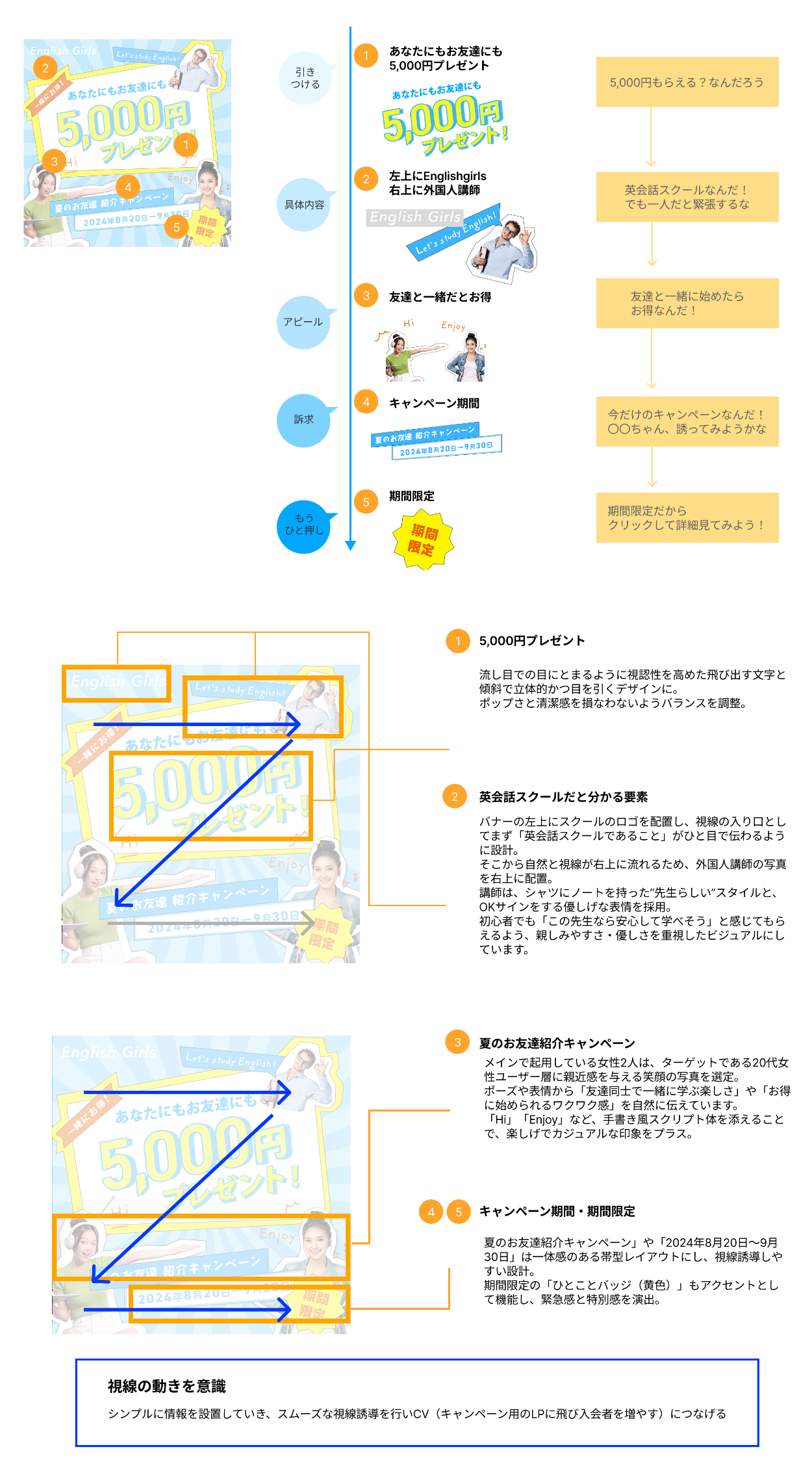 伝えたい情報に対してどのようにアピールをすればターゲットに刺さるか他社のバナーを「配色、フォント、あしらい、テクスチャ、配置」の観点で確認しデザインへと落とし込むよう心がけました。
