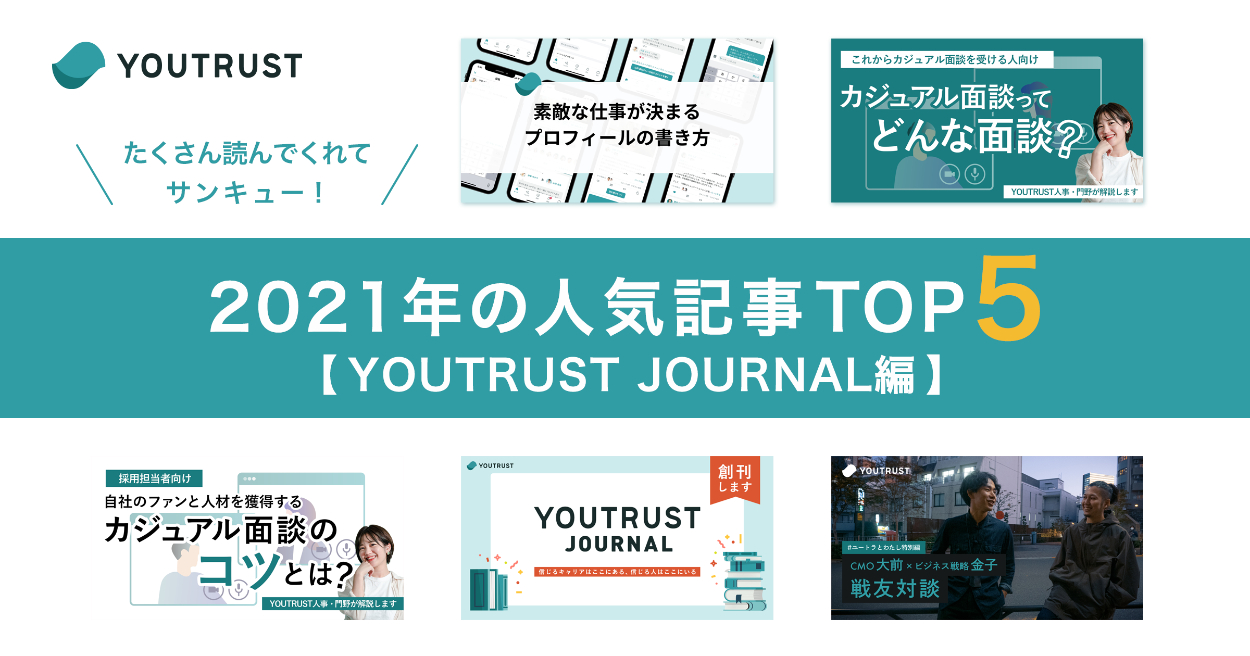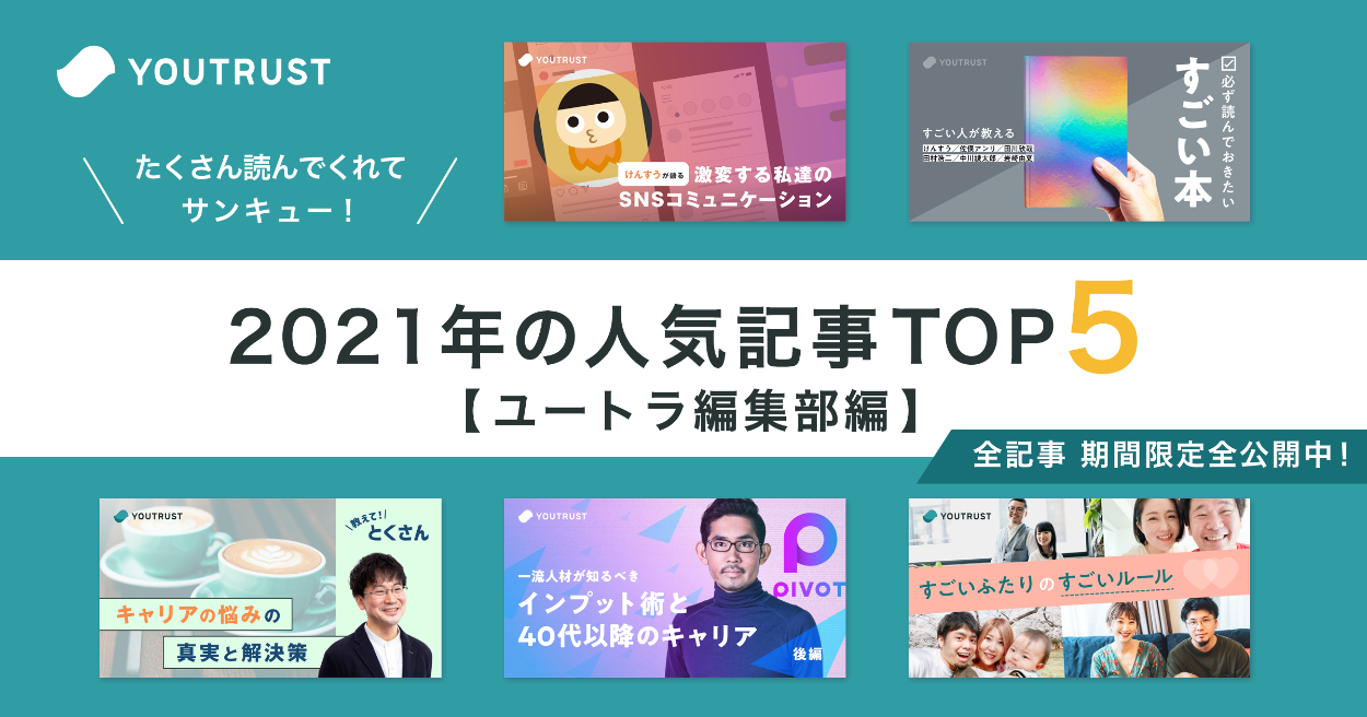 キャリアのSNS「YOUTRUST」記事内アイキャッチ みくるべみえ イラストレーター/アイキャッチデザイナー キャリアのSNS「YOUTRUST」ユートラ編集部、ユートラジャーナル記事内バナー作成。たくさん読んでくれてサンキュー!2021年の人気記事TOP5【ユートラ編集部編】たくさん読んでくれてサンキュー!2021年の人気記事TOP5【YOUTRUST JOURNAL編】