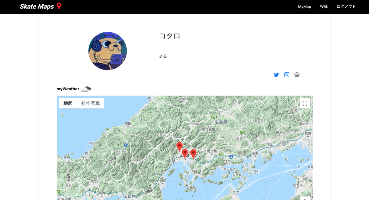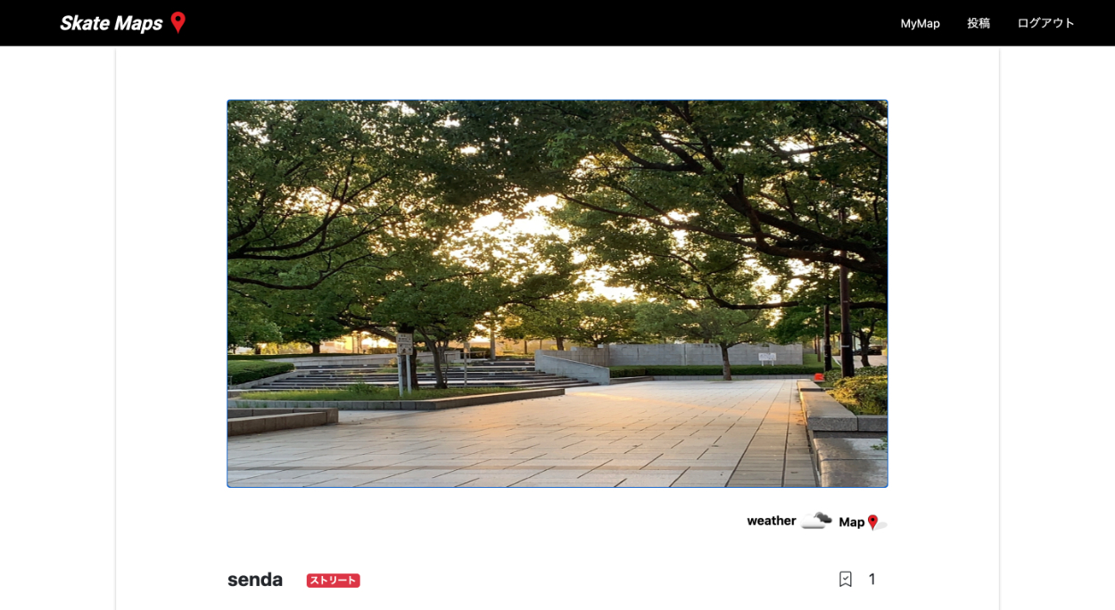 Mapには、投稿されたspotの場所を示すピンが表示されてます。