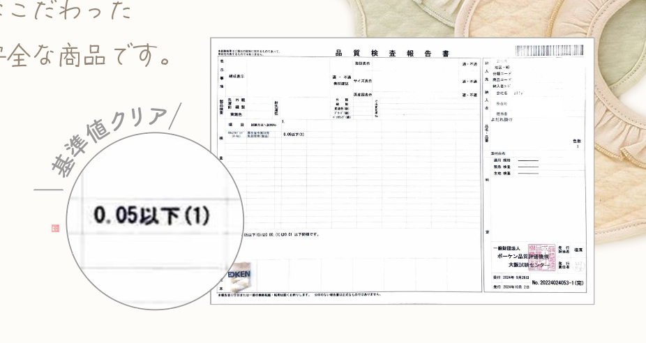 ・上段では、ホルムアルデヒド試験に合格している商品であることが分かるよう、検査報告書を配置し、さらに基準値クリアの数値をアップにすることで、より安心感が出るようにしました。