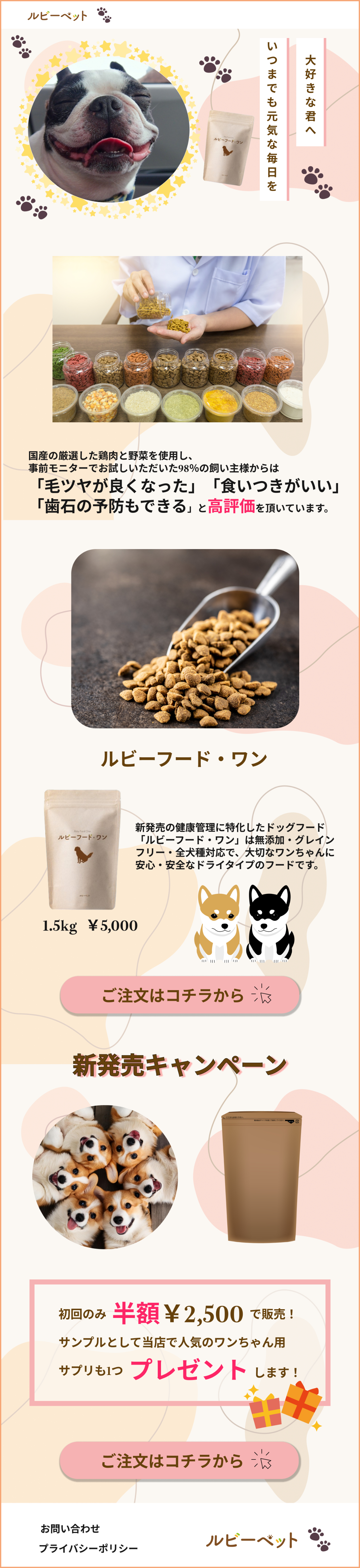 ワンちゃんの健康管理フード「ルビーフード・ワン」を販売開始することになりました。 GDNバナー広告、リスティング広告、弊社公式HP内バナーからLPへ誘導し、購入していただく流れになります。 新発売キャンペーンとして初回のみ半額2,500円で販売、サンプルとして当店で人気のワンちゃん用サプリも1つプレゼントします。