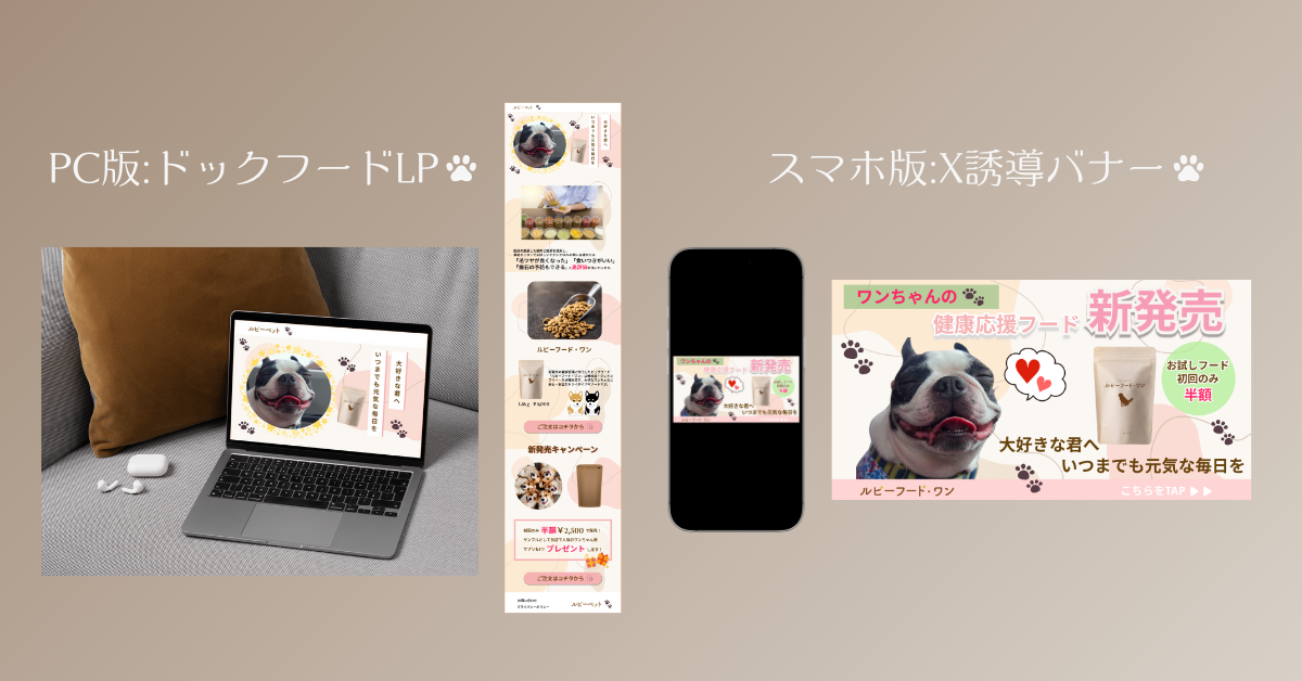 愛犬家の方がターゲットだったので、ワンちゃんの写真やイラストを入れ可愛さも取り入れつつあまり情報がゴチャゴチャしてしまっても分かりづらいので商品説明の所は、商品写真と説明でシンプルにしつつ、キャンペーンの所でお得だよと伝わる様に緩急をつけてデザインすることに意識しました。ターゲットペルソナがお金を惜しまない愛犬家の方だったので、大人の方を想定し全体の背景を淡く優しい印象にして派手過ぎずでも可愛らしさも意識したデザインにしました。