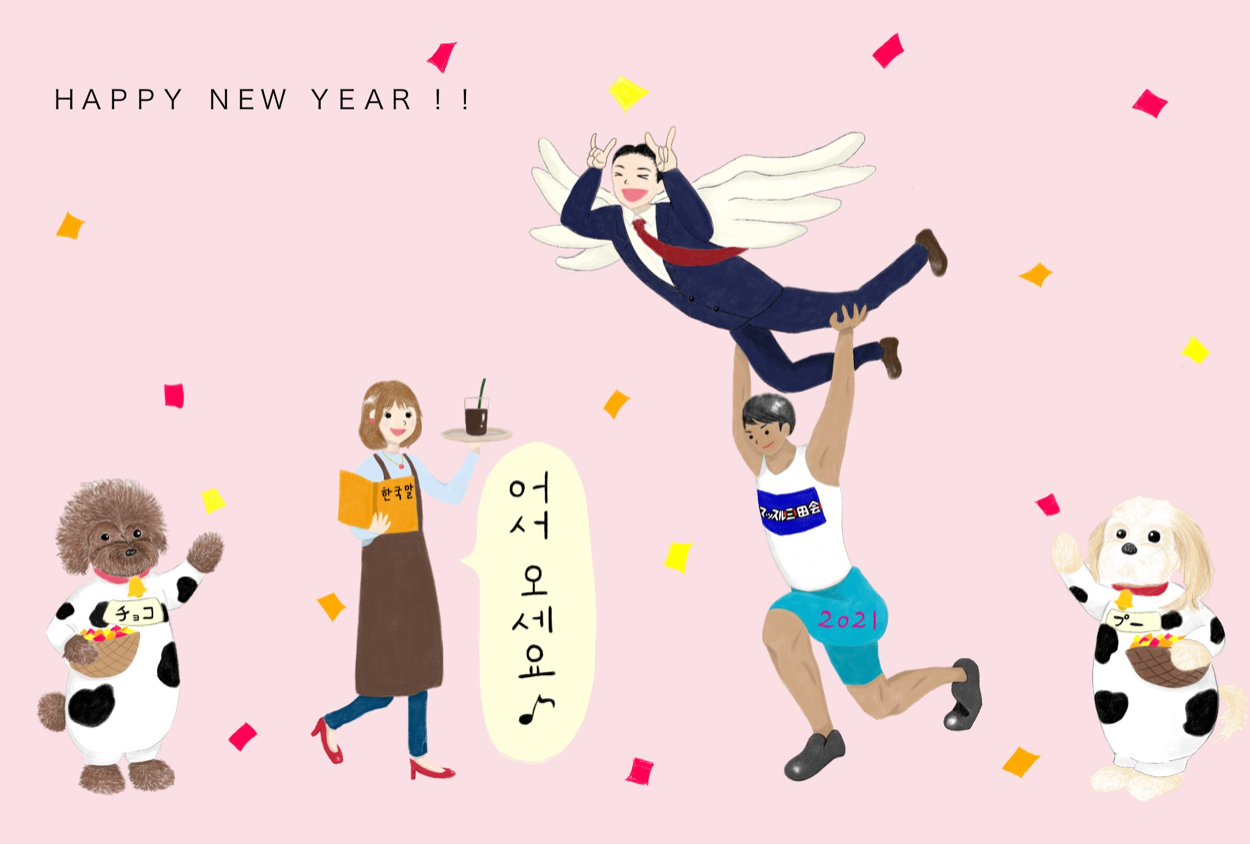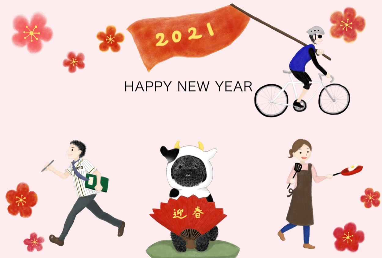 年賀状オーダー saor.iro イラストレーター 年賀状用に、ご家族のイラストを描かせて頂きました。近況や、今年取り組んだ事を絵にして欲しいとのご要望で、対面やメールにて、細部までリクエストを頂いた上でデザインさせて頂きました。