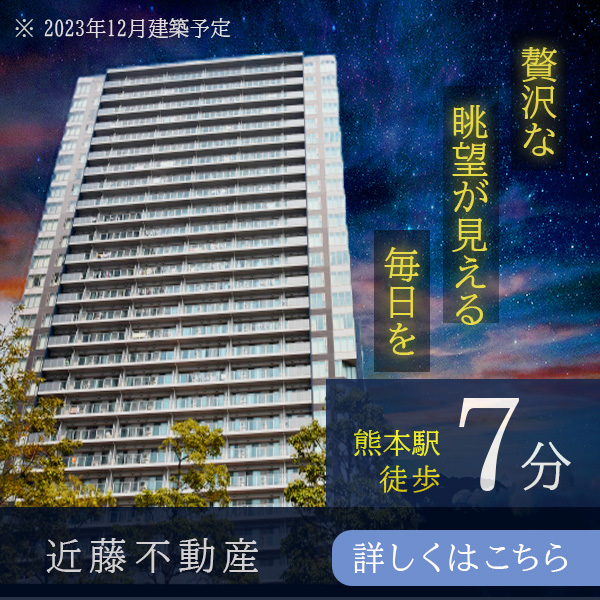 〈想定する顧客〉高層マンションを販売している近藤不動産(架空)〈要望〉熊本駅徒歩7分の高層マンション建築予定の広告バナー制作。新規顧客獲得のため、Yahoo!などのWEBサイトに掲載予定。サイズ600×600pixel。