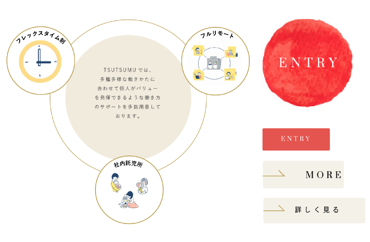 「やさしさでつつむ」という温かみのある企業コンセプトと転職サイトである点から、「やさしさ」と「28歳女性向け転職サイト」の2つを意識し、ベージュカラーをメインカラーとしました。また、この2つを軸に温かさ・優しさ・活力を表現する配色を設定しました。