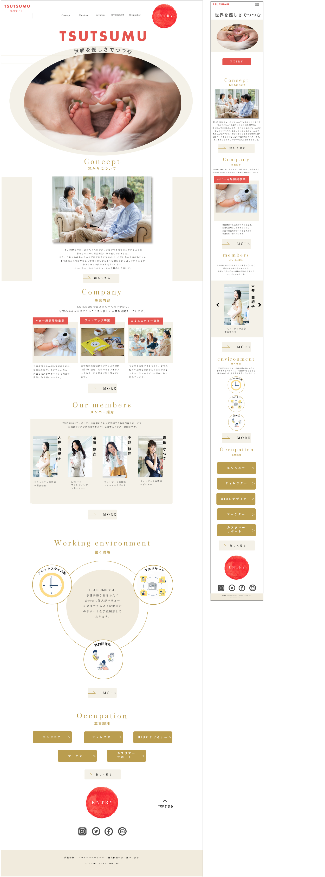 SHElikes MULTI CREATOR COURSEの課題。ベビー用品事業を行う企業の採用サイトの制作に取り組みました。クライアントからの要件を元に作成・実装し、レスポンシブ対応まで行いました。