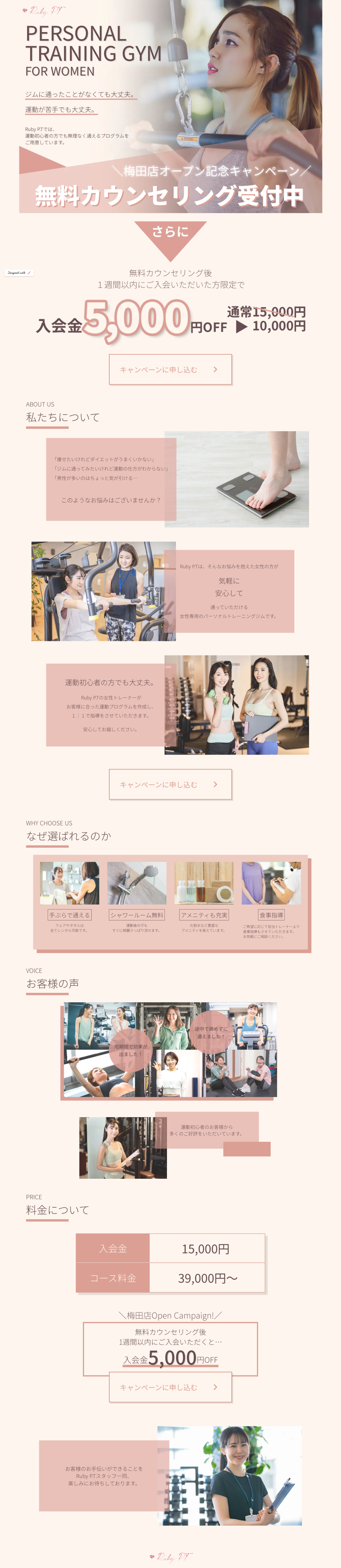 梅田店オープンに伴い、Instagram広告、GDNバナー広告、リスティング広告を打ち、LPへ誘導。LPを見たターゲットに無料カウンセリングの申し込みとジムへの入会をしてもらいたい。