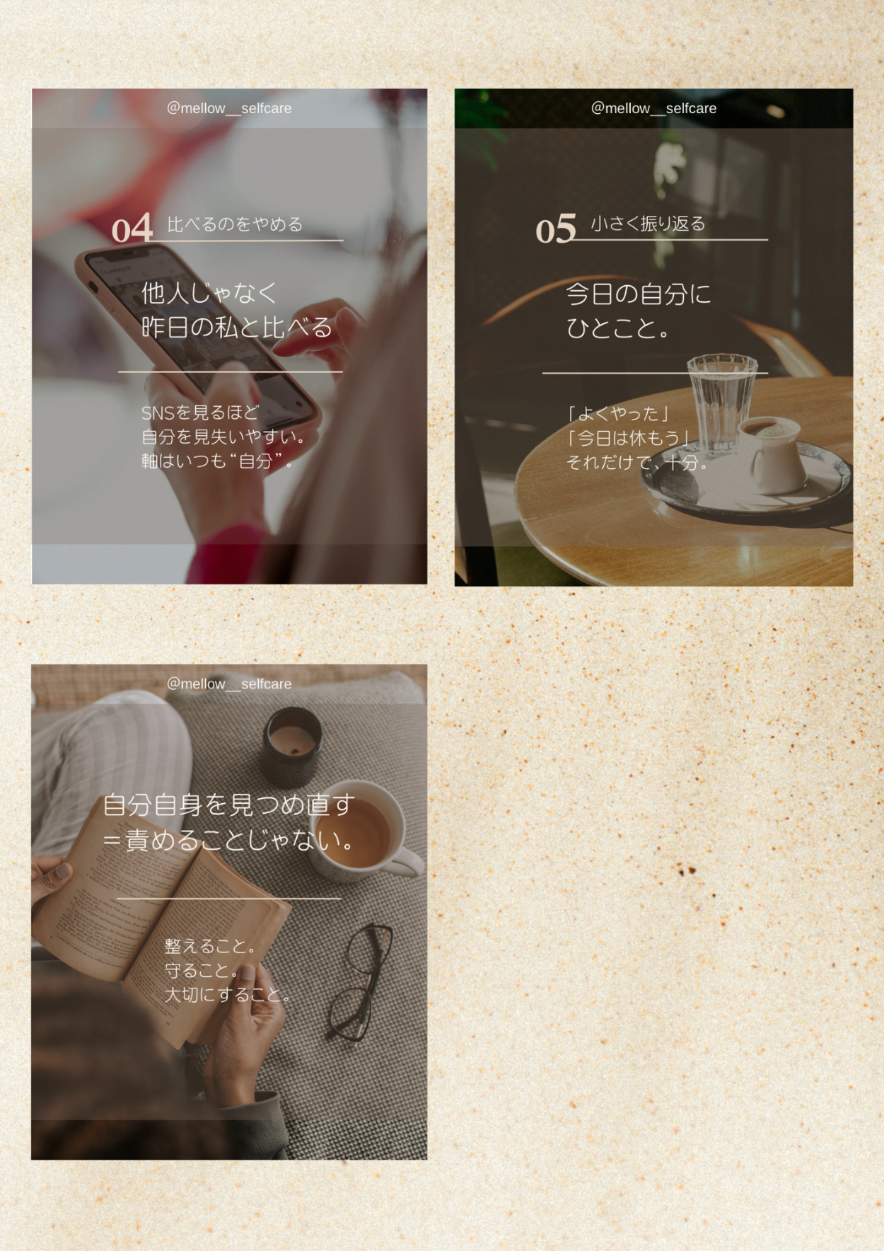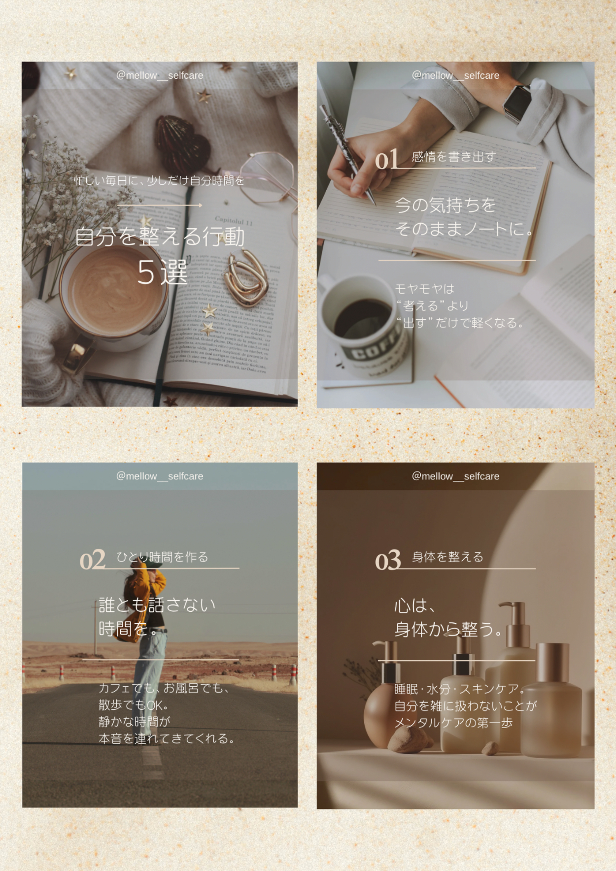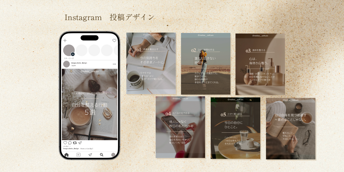 ライフスタイルと美容を掛け合わせた情報発信アカウントInstagram投稿デザイン。 「整える」をテーマに、世界観を統一したスワイプ型投稿を設計しました。