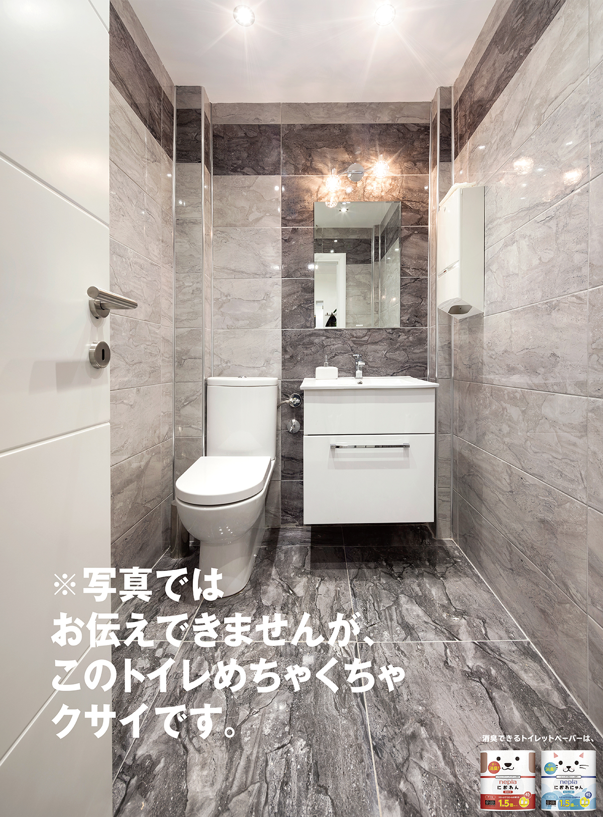 せっかくのカッコイイトイレも臭いで台無しに。写真ではお伝えできない、におわん&におわにゃんの活躍するシーンを表現しました。