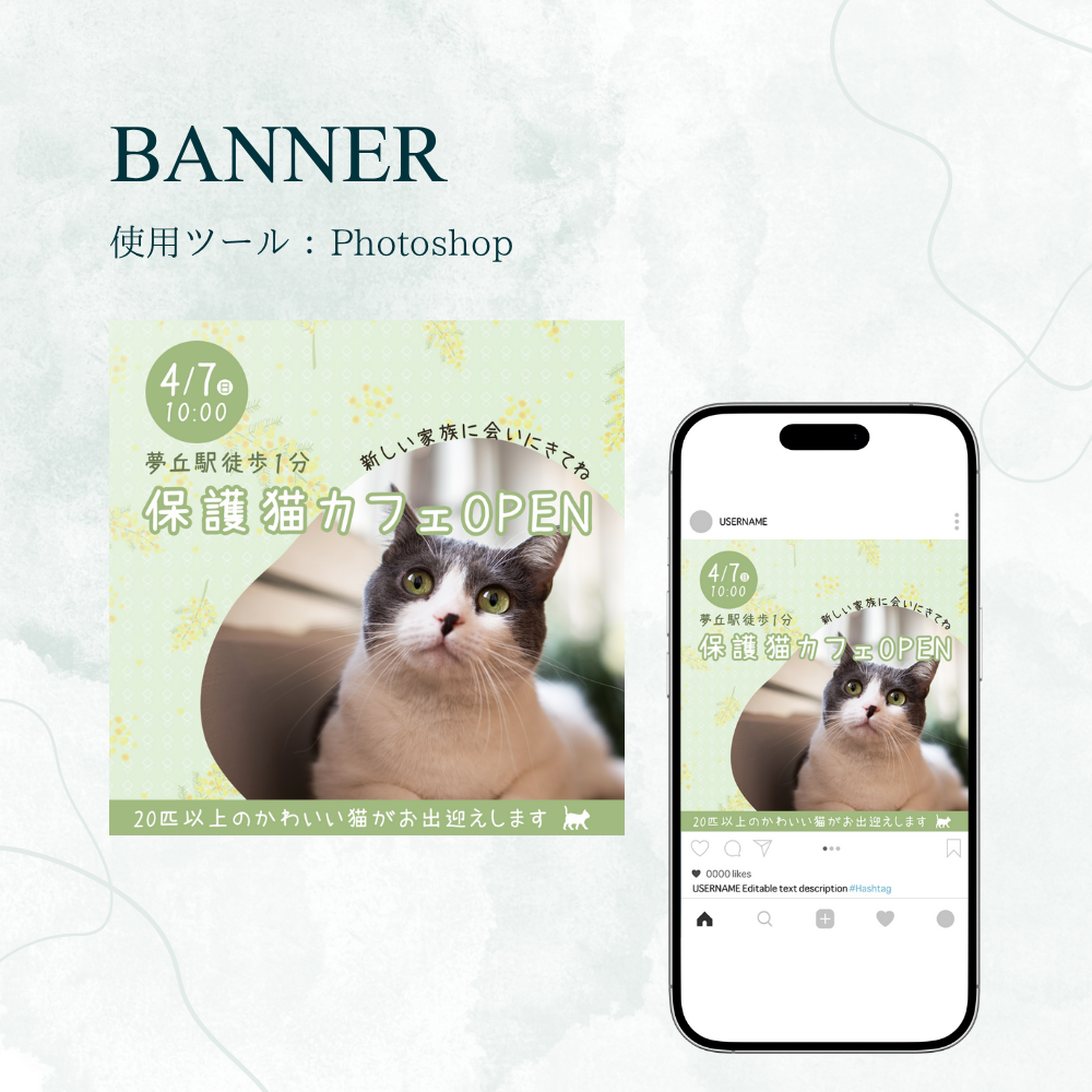 ・猫の写真は丸みおびた図形の中に入れ、優しさと柔らかさを意識しました。
