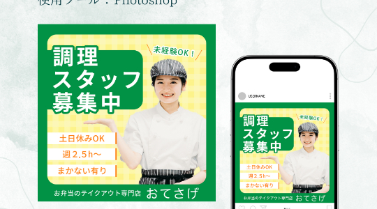 ・オープン日が春ということで、淡いグリーンを使用し、ミモザの花も背景に取り入れかわいらしさも出しました。
