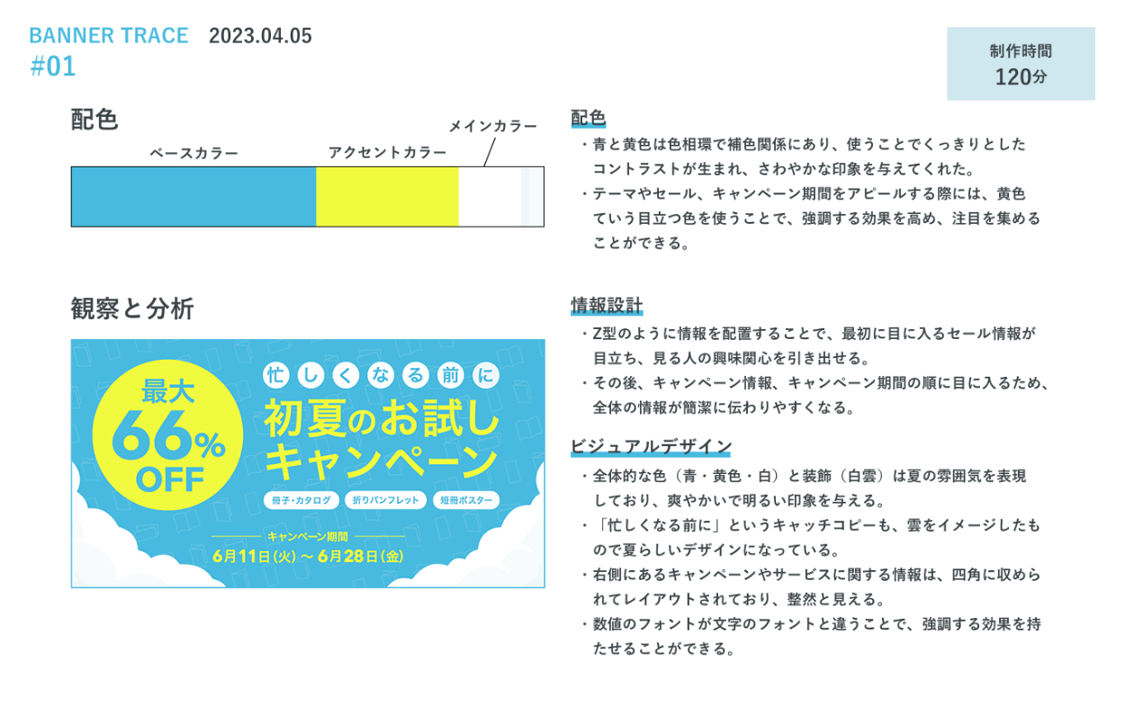 SHElikes MULTI CREATOR COURSEにて、バナートレース課題に取り組みました。また、今回のバナーの「ターゲット」「目的」「配色」 「情報設計」「ビジュアルデザイン」について、分析結果をまとめました。(バナートレース制作時間:2時間)