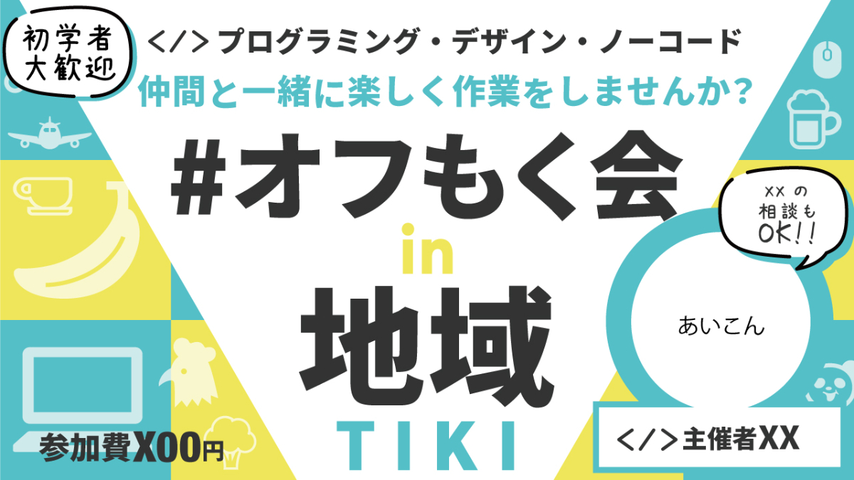作業会の案内のバナー。気軽に参加できる雰囲気をだせるように、色合いと淡い色とポップなテイストにして、背景の装飾は主催者が好きなものを散りばめました。開催地や何をするのか視覚で1番に入るように文字のジャンプ率を意識して制作しました。