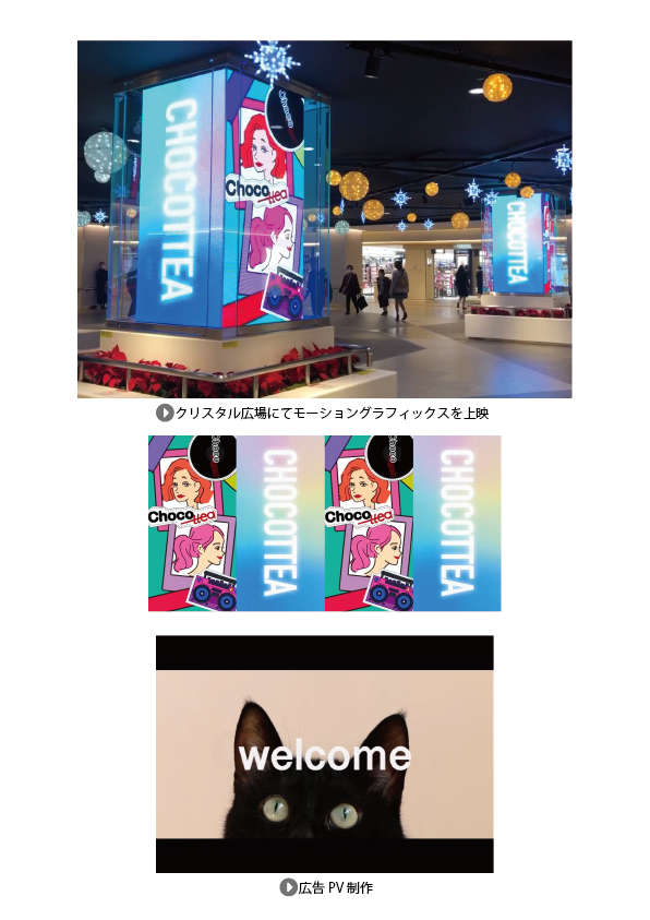 【電子広告】名古屋 栄クリスタル広場ビジョンにて放映 こんみ デザイナー 架空で作成したブランド【chocottea】の宣伝映像を名古屋市栄のクリスタル広場にて放映した。モニターの形状を生かした映像を心がけ制作いたしました。 WEBSITE