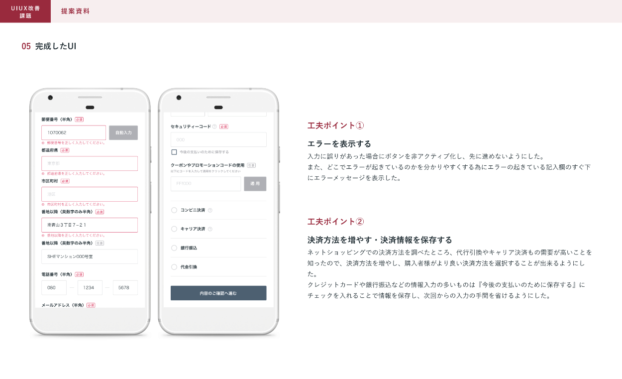 目的に合った改善を考えて形にするだけではなく、提案内容をクライアントにわかりやすく言語化し、言語化だけでどのように修正をしたのか伝わるように意識して説明していくことがとても大事だと感じました。