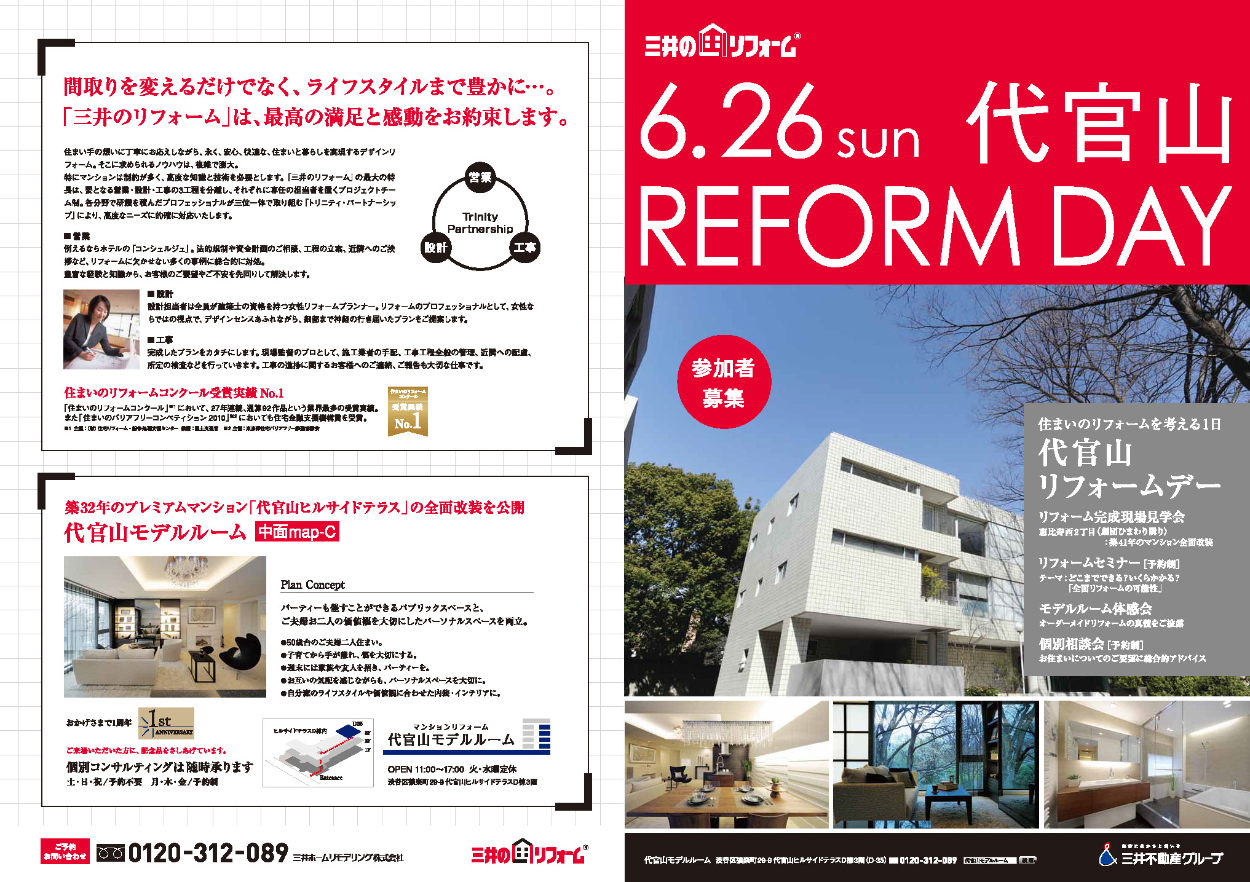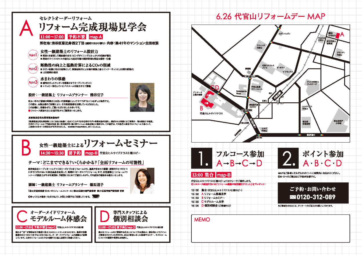 三井のリフォーム「代官山リフォームデー」チラシデザイン 本多理美 satomi honda グラフィックデザイナー 三井のリフォームが開催する、「代官山リフォームデー」参加者募集のためのチラシ(B3二つ折り)を制作しました。代官山周辺が会場であることから、色数を抑えてスタイリッシュな紙面を目指しました。