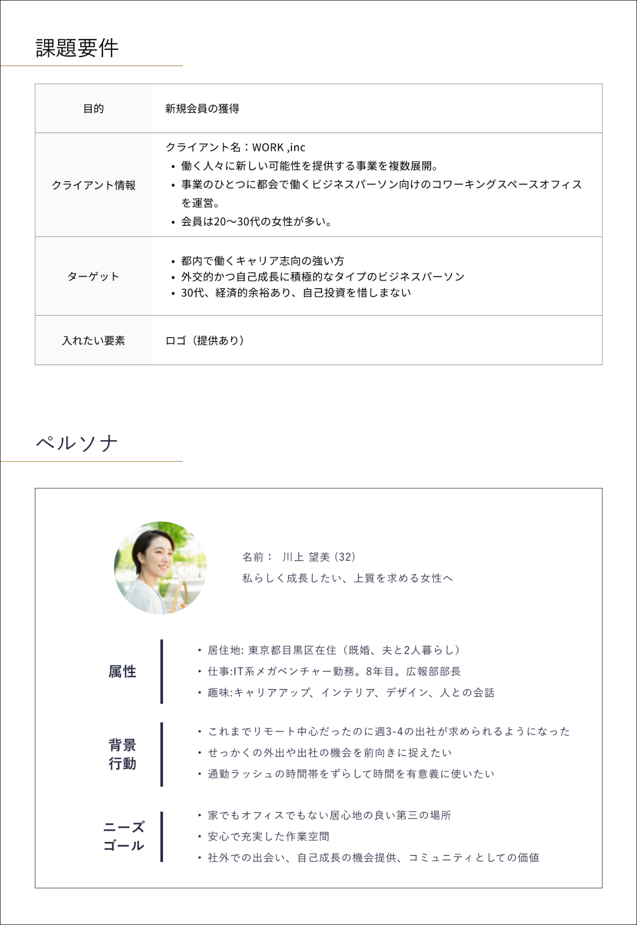 今回の課題では、クライアントの要望だけでなく、ターゲットユーザーがどう感じ、何を求めているかを考えて情報を選ぶことの大切さを学びました。