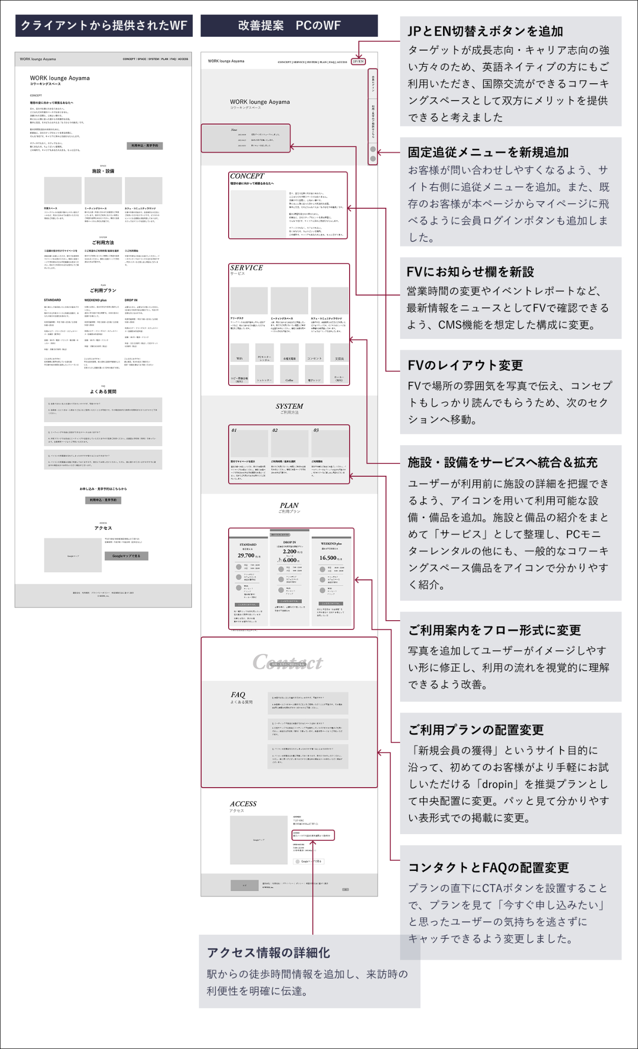 ユーザビリティ及びコンバージョン向上の観点からクライアントより提供されたワイヤーフレームをブラッシュアップ。