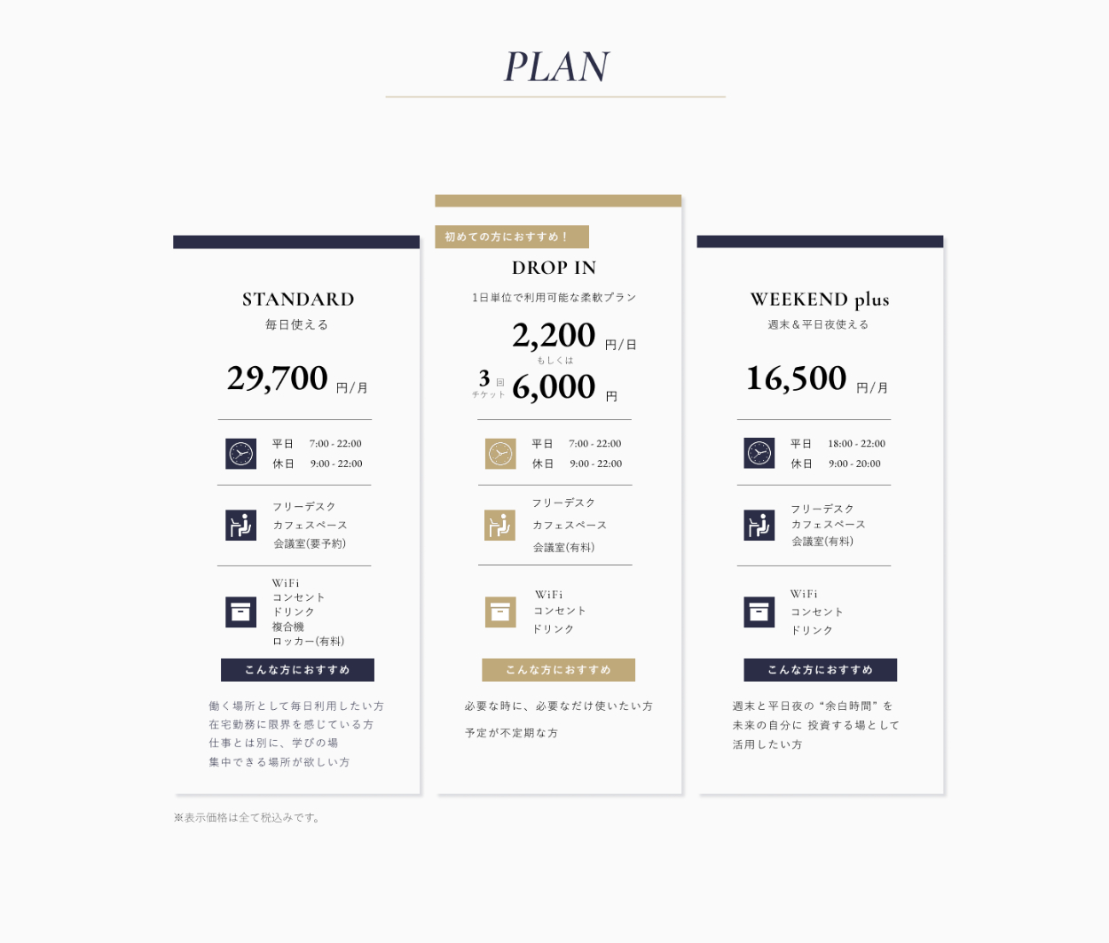 プランレイアウトを見直し、新規会員獲得の観点からユーザーが試しやすい最も安価な「DROP IN」を推奨プランとして目立つ位置に配置し、視認性の高い表形式で表示しました。