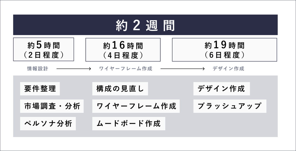 要件整理・市場リサーチ・分析に約5時間(2日程度)、構成の見直し・ワイヤーフレーム作成・ムードボード作成に約16時間(4日程度)、デザインカンプ作成・ブラッシュアップに約19時間(6日程度)というスケジュールで制作いたしました。