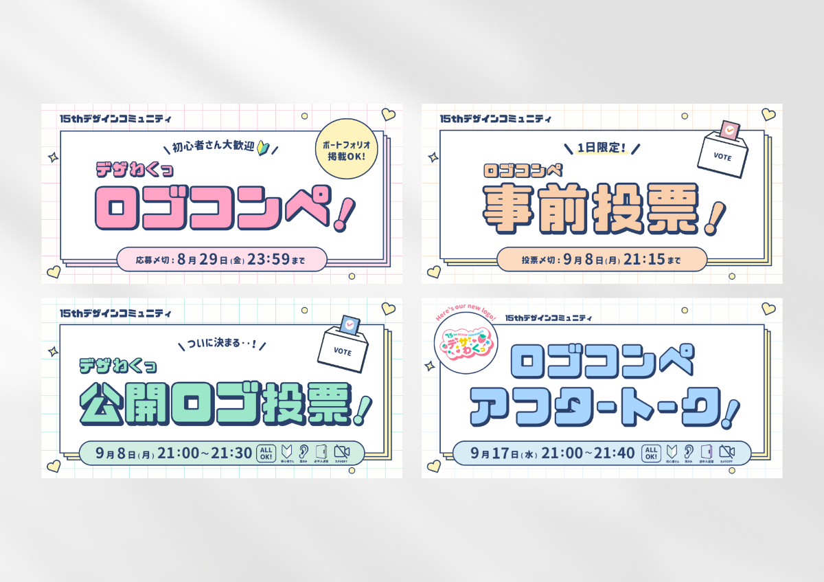 女性向けキャリアスクール「Shelikes」の受講者コミュニティの「ロゴコンペ」イベントで使用するバナーを制作しました。ターゲットに合わせた優しいトンマナとイベントの賑やかさが伝わるようデザインしました。
