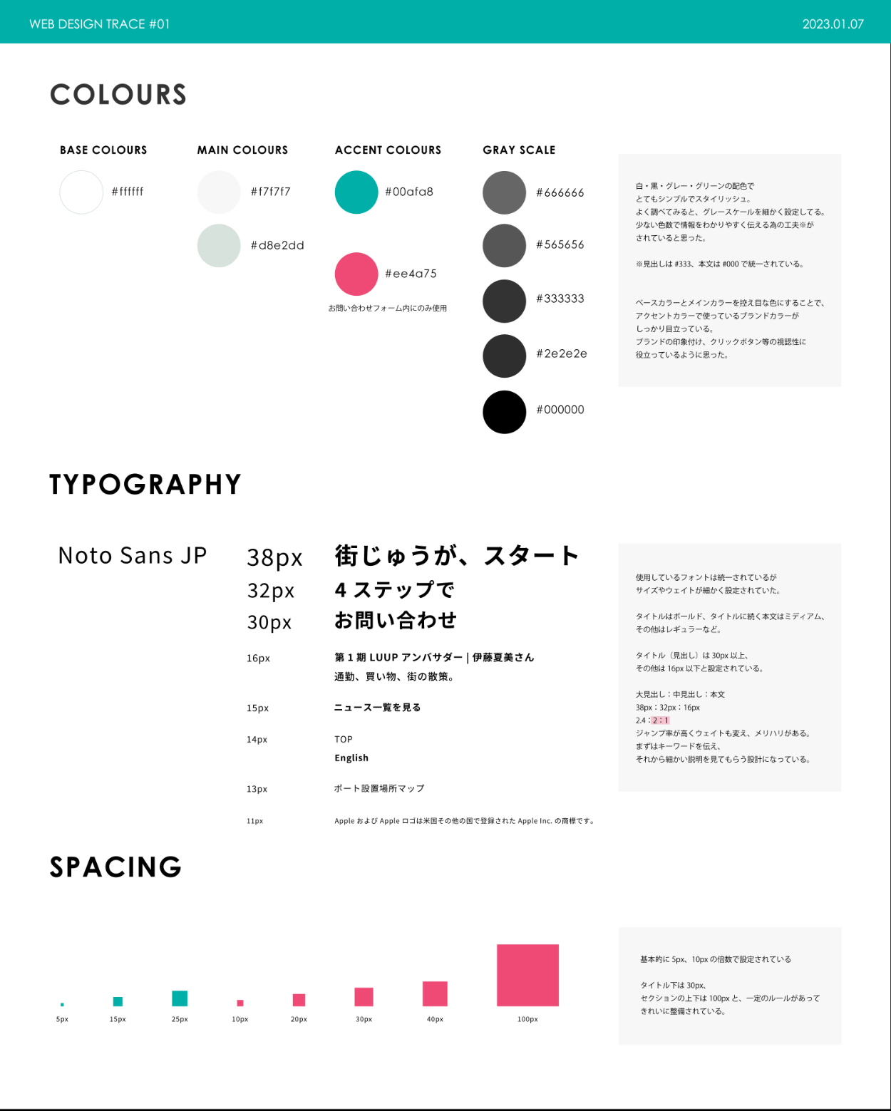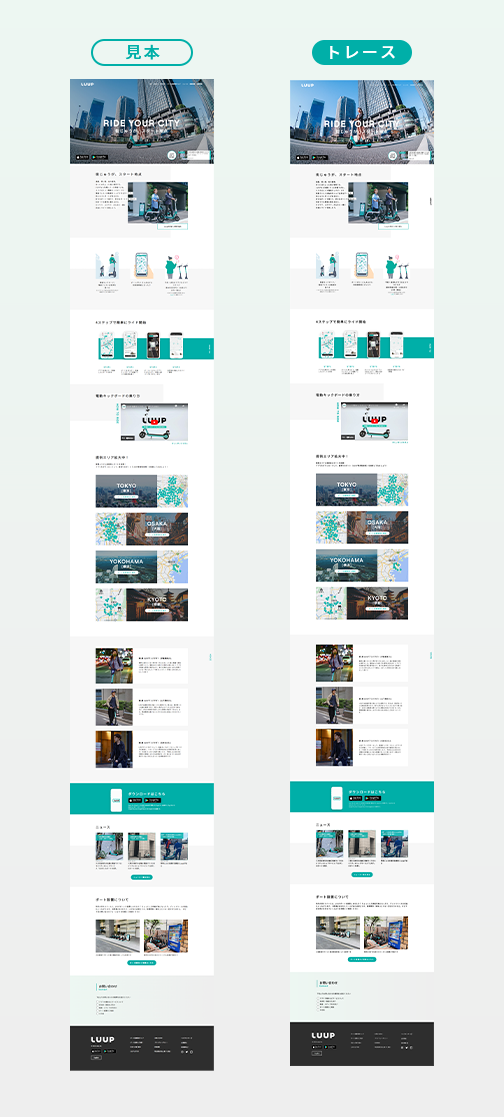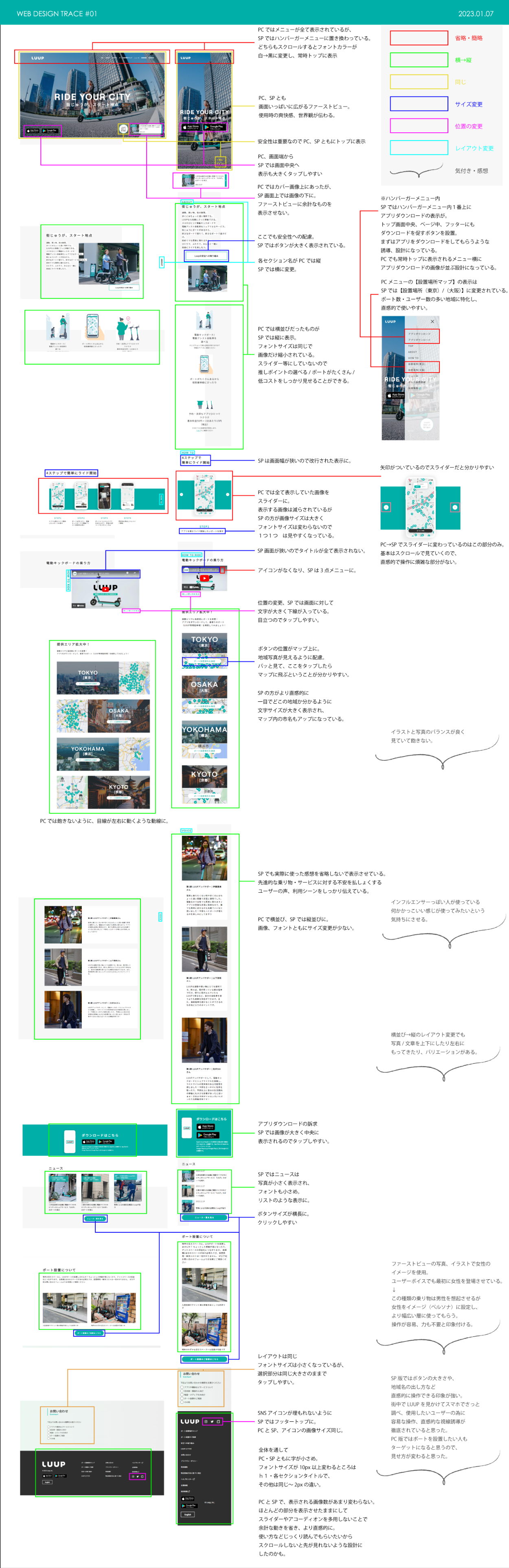 バナートレース よねざわ ゆか webデザイナー OVERVIEW 引用元:https://luup.sc/ YEAR 2023 LP トレース・分析デザインの感覚をつかむ余白、フォントサイズの感覚をつかむデバイスによるレイアウトの変化を学ぶトレースしたLPスタイルガイドデバイスによるデザインの比較