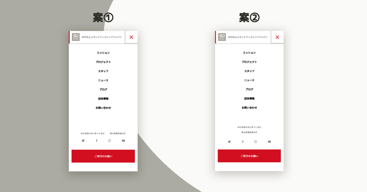 PCのフッター、SPのハンバーガーメニューの修正をするにあたり、それぞれデザインを2案ずつ提案しました。
