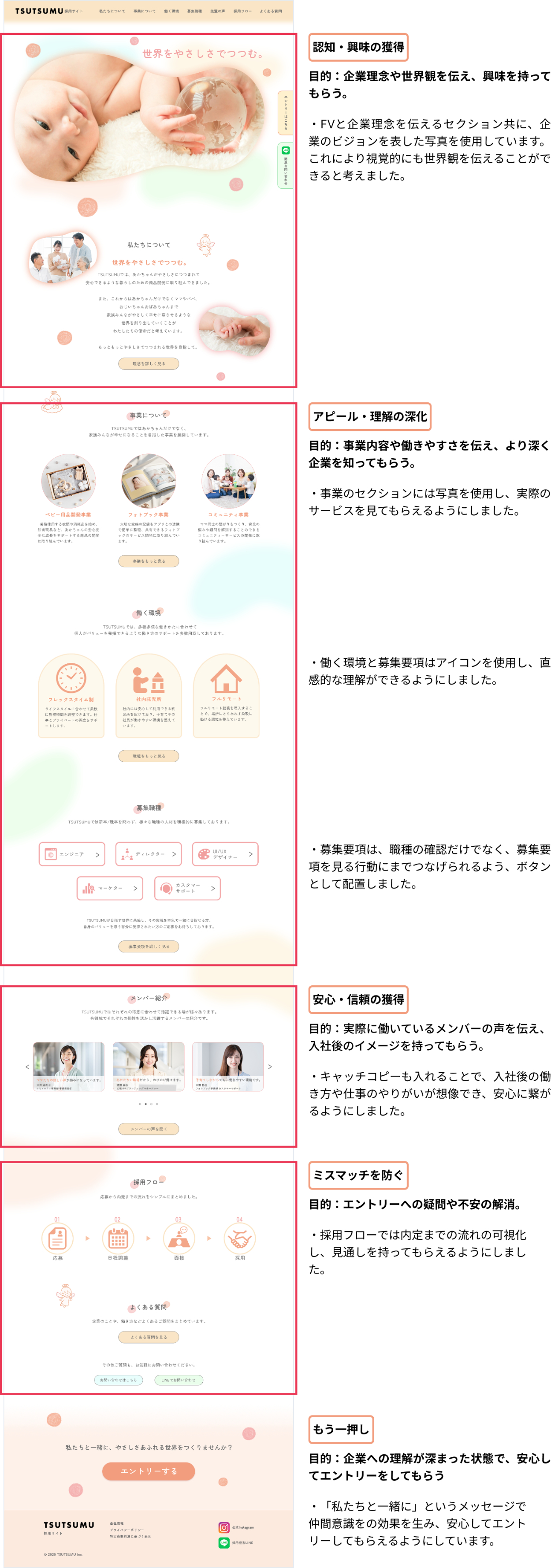 SHElikes PROデザイナーの課題にて、ベビー事業を運営する会社を題材にした『TSUTSUMU』の採用サイトを制作しました。