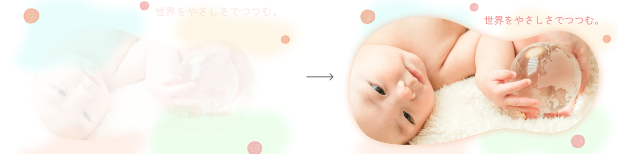 ・背景に使われているほわほわとしたあしらいは、やさしさをイメージしています。様々な色、形のやさしさが赤ちゃんを包むように、様々な個性を持った人々が企業に集まって「世界をやさしさでつつんでいく」様子もイメージしています。