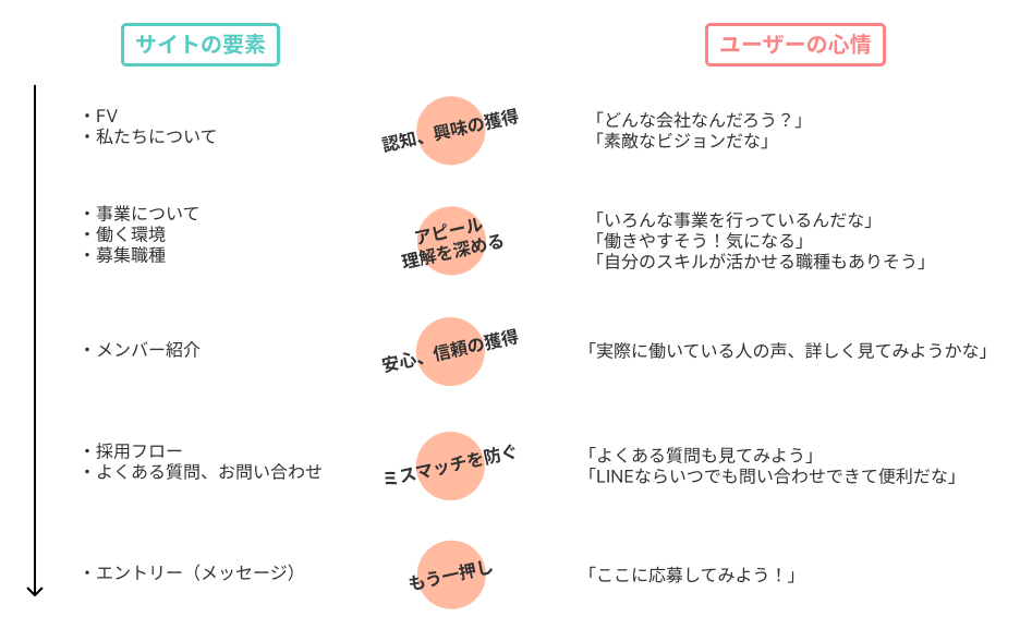 ・今回はペルソナ分析も自身で行い、ワイヤーフレームも1から作りました。最初の要件定義をしっかり行った上で情報設計に落とし込むことで、「採用サイトとしてエントリーに繋げる」という本来の目的からブレることなく制作を行うことができたと感じています。改めて要件定義の重要性が身に染みた課題でした。