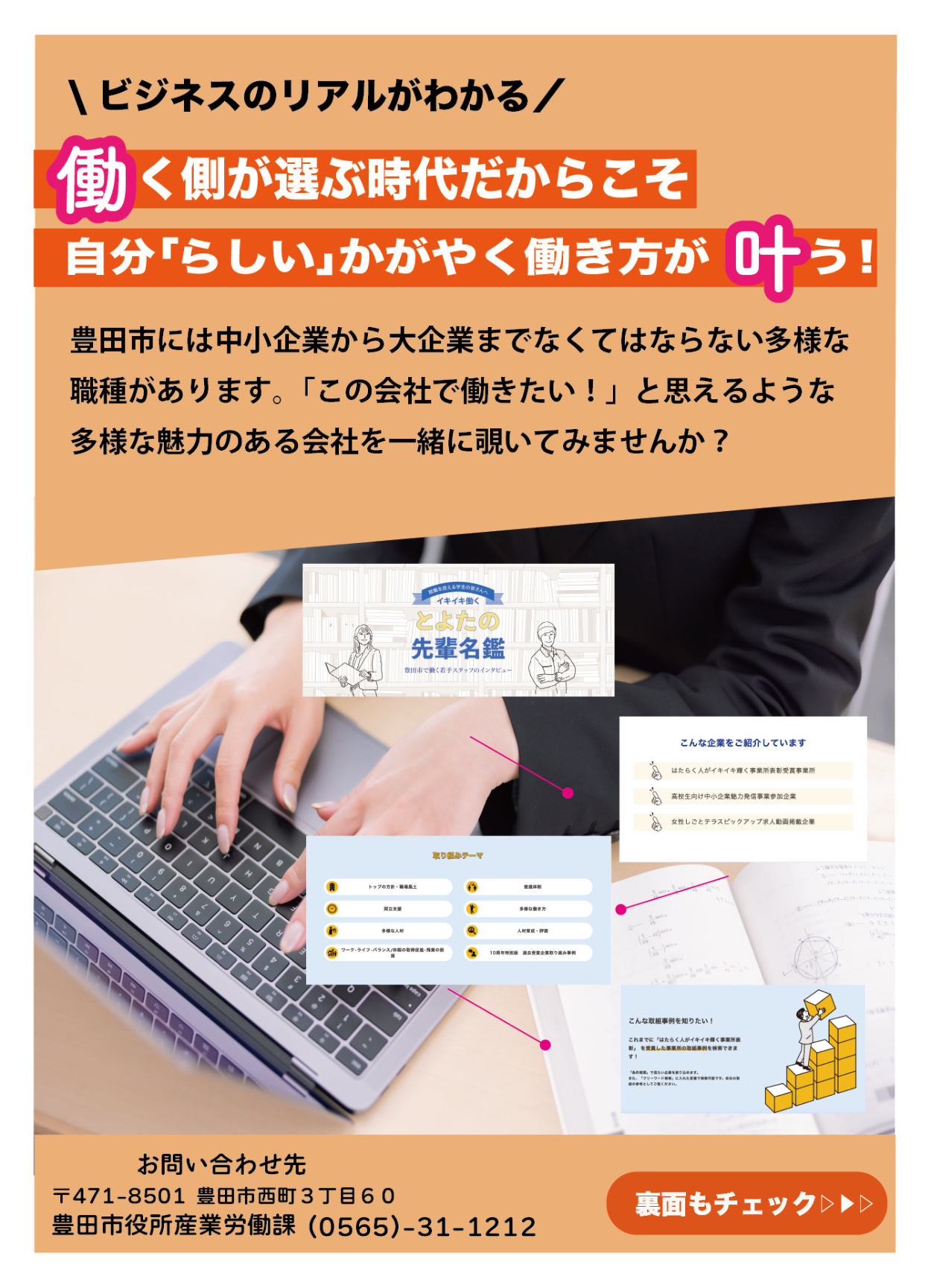 2)見出しの言葉を裏面でそれぞれ説明、HPに繋がるORコードへ誘導
