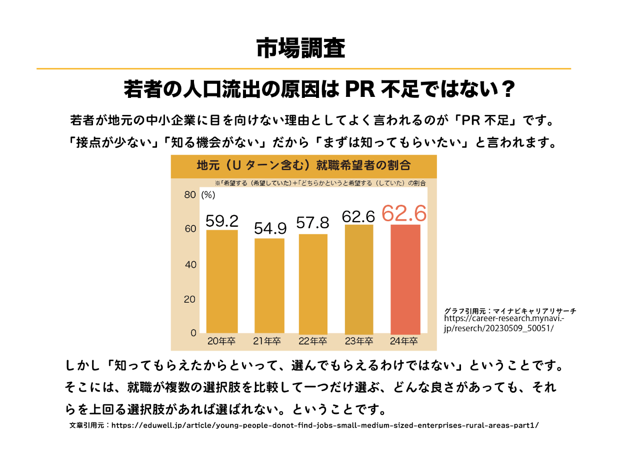 主に「若者の求職者がなぜ地元の中小企業に就職しずに離れてしまうのか」の原因を調査した結果、地元での就職希望者の割合が年々増加傾向のあるにもかかわらず、企業の魅力が求職者に届ききっていないことがわかりました。