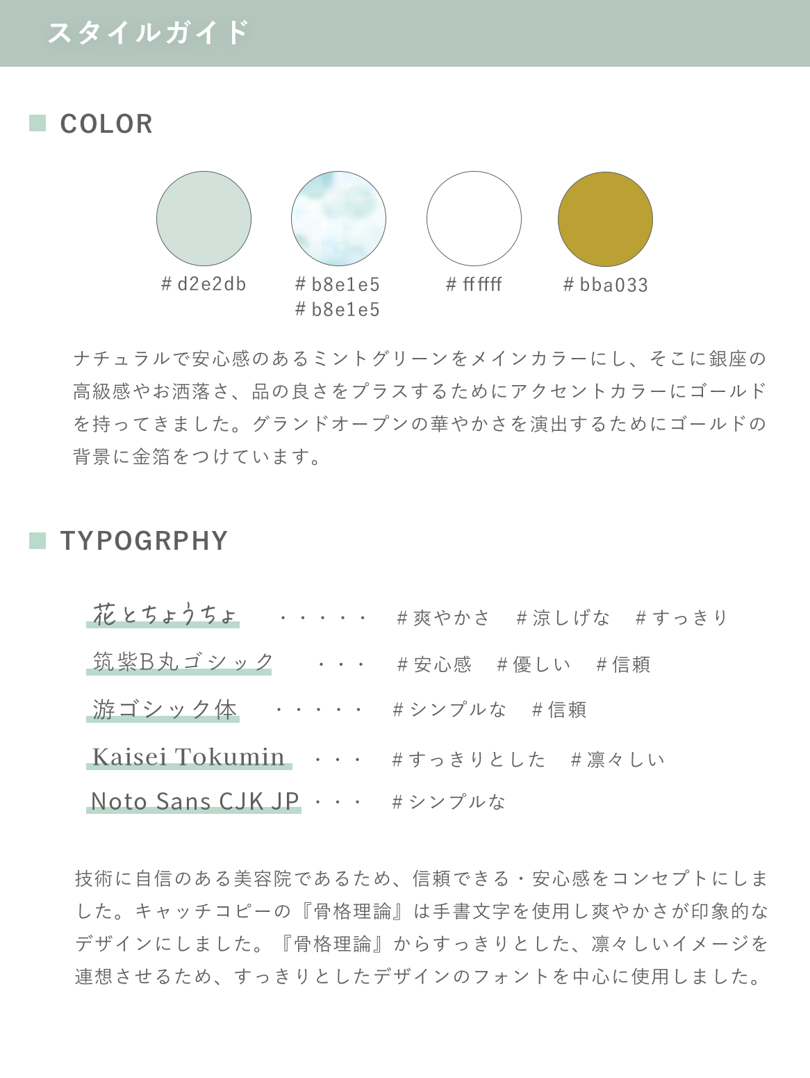 - ユーザーストーリーとして、家のポストにチラシが入ってきた時に、美容院の店名よりも『何かがオープンするんだ』というワクワク感が先に来た方がいいと感じ、グランドオープンの文字を一番大きく設計しました。