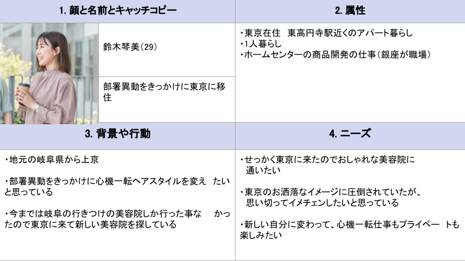 - クライアントの要望から『少し高めの料金設定であっても確かな腕のスタイリストに担当してもらいたい、ヘアスタイルにこだわりのある方』とありましたので、技術に自信のある美容院だけど信頼できる・失敗したくない方へ#信頼感や#安心感をコンセプトにしました。