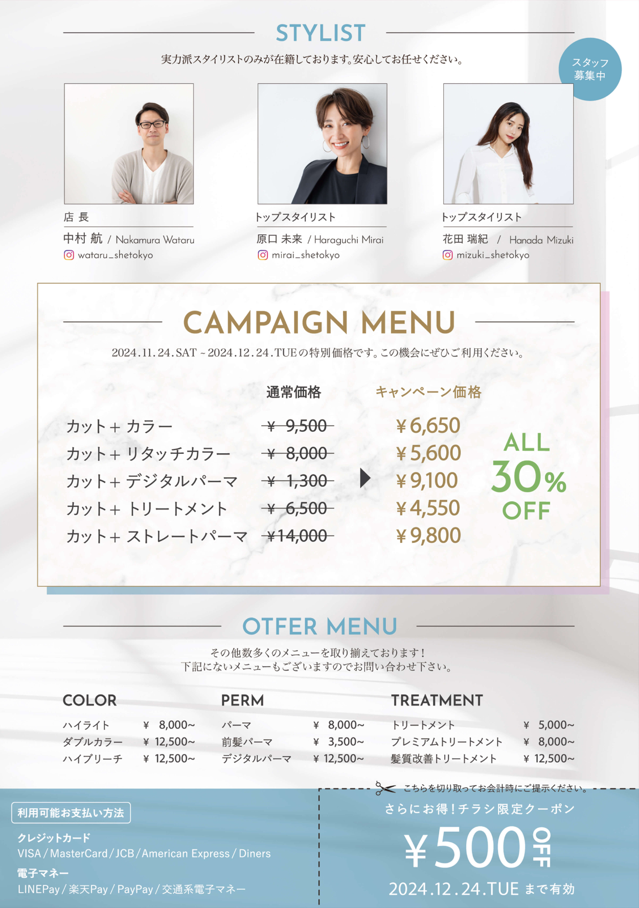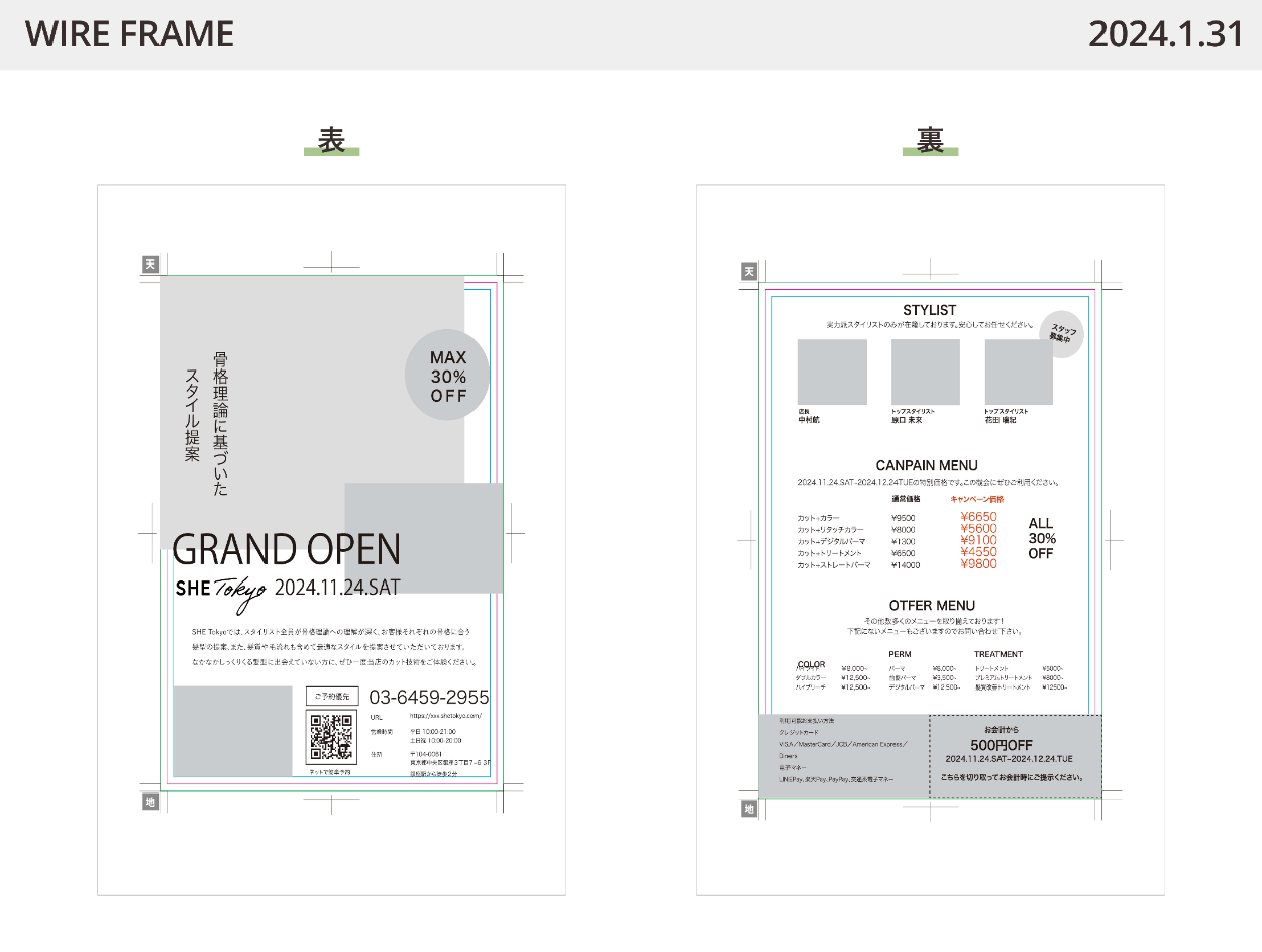 チラシの右下にクーポン券を付けることが先に決まっていたので、料金周りの情報がチラシの下部にまとまるように、スタイリスト紹介はチラシ上部に掲載しました。